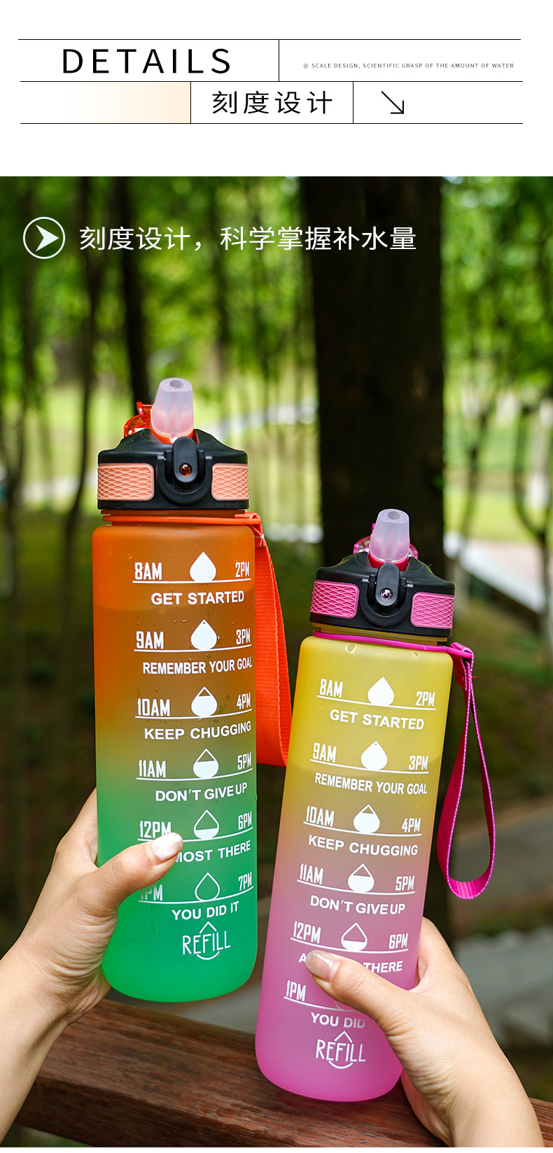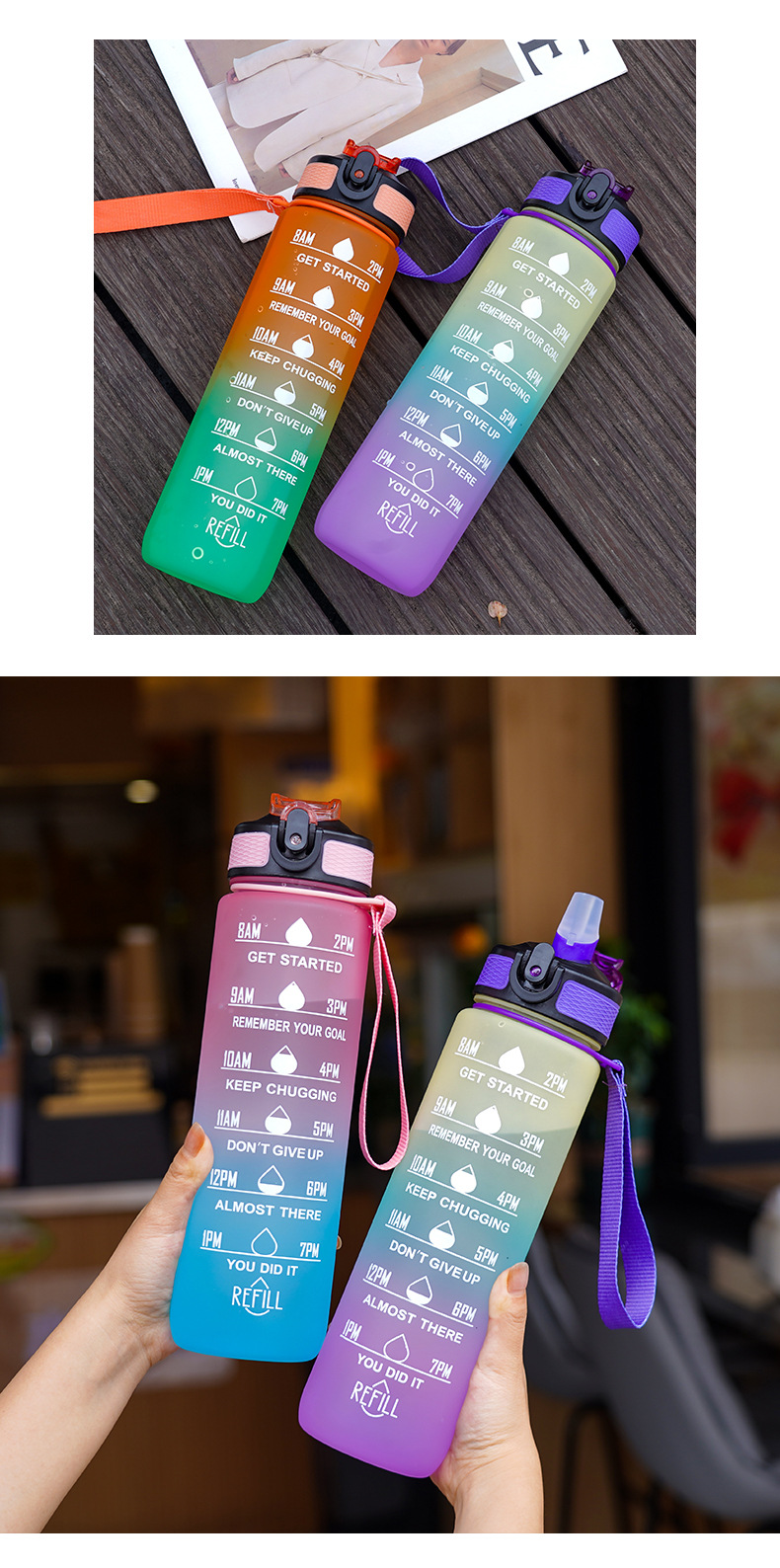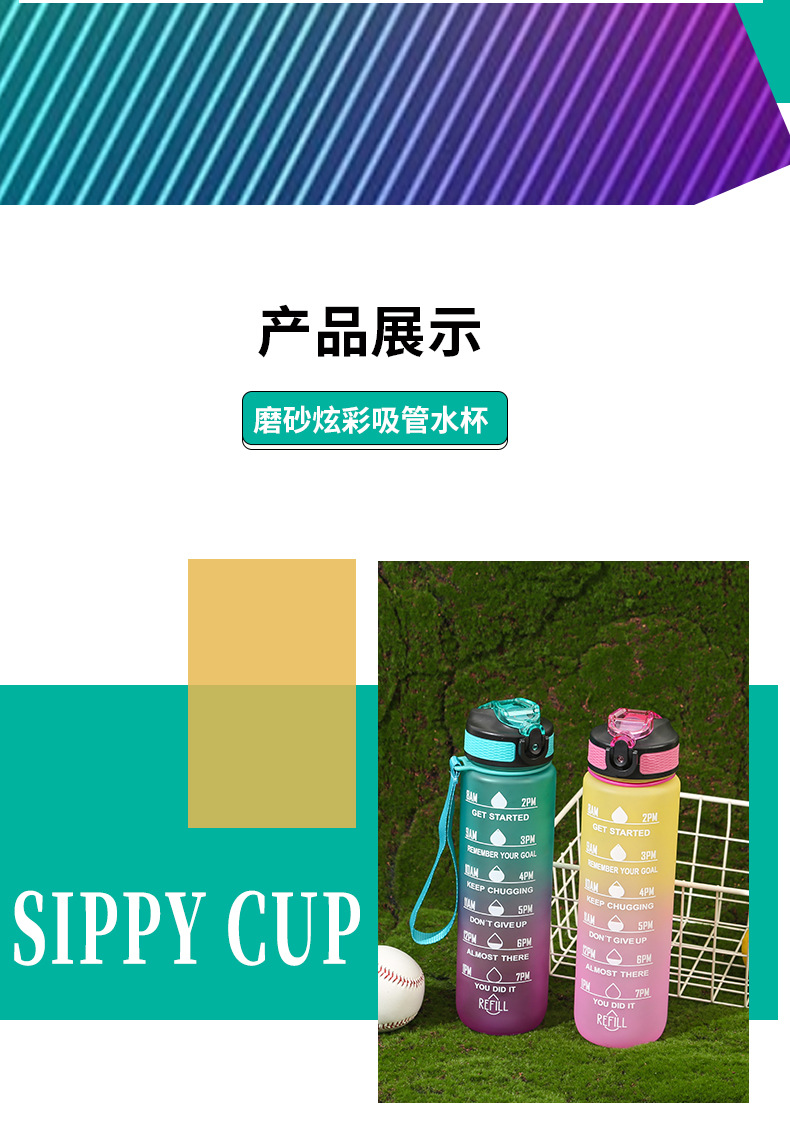 简约渐变色磨砂塑料运动杯手提绳便携耐摔水瓶800ML吸管太空杯子
