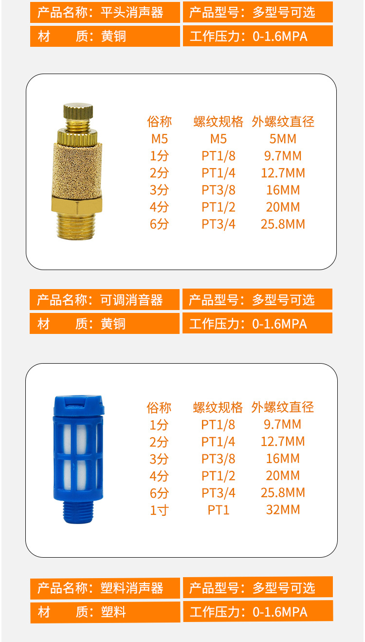空気圧機器用全銅製消音器 尖頭/平頭/調整可能/プラスチック製消音器 BSL-M5 騒音低減