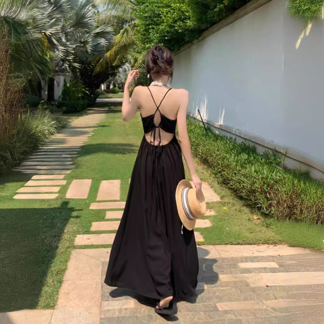 白黒のストラップのワンピースのロングスカート2025の新型の夏のデザイン感の小さい大衆の修身はやせている長いスカートを現します。