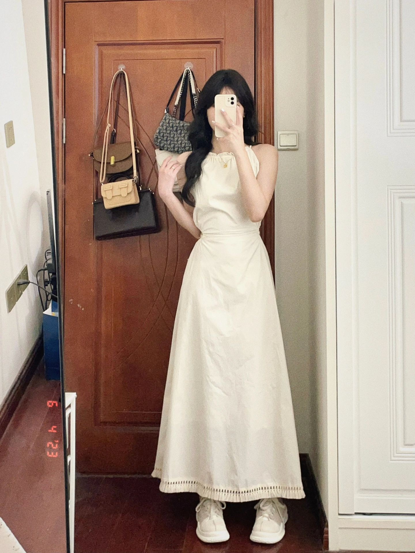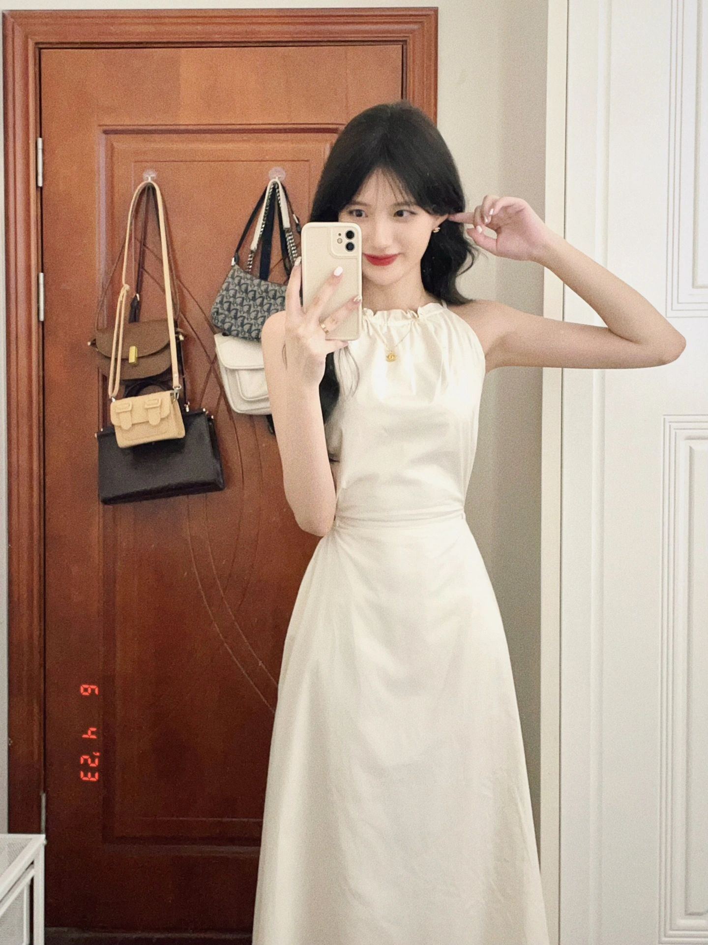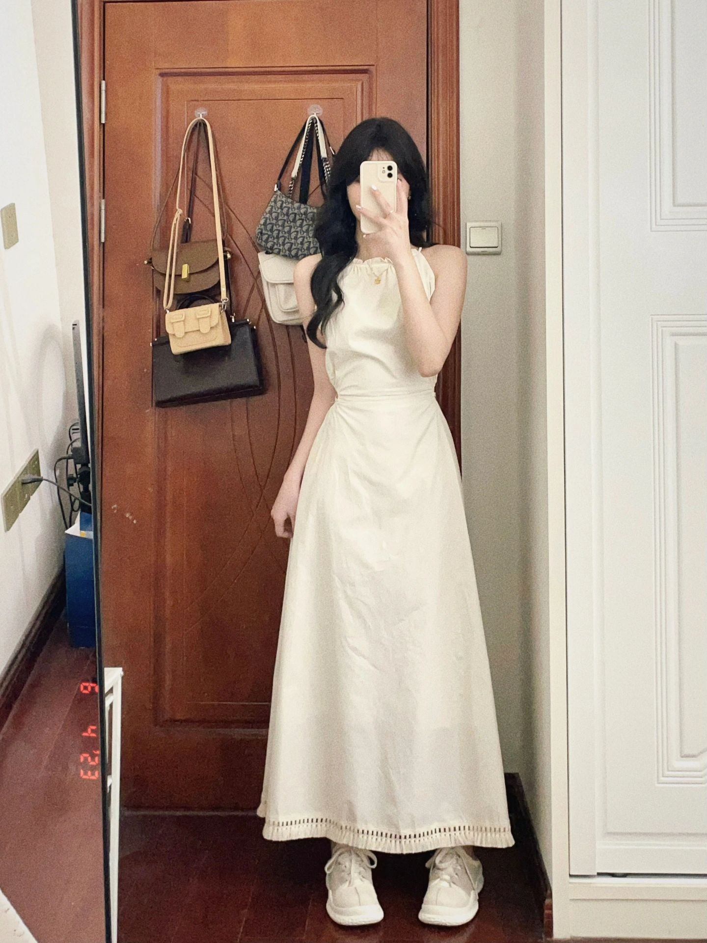 白いクロスストラップのワンピースは腰を収めて痩せている女性の夏2025の新しい気質の優しい風が首の長いスカートを掛けます。