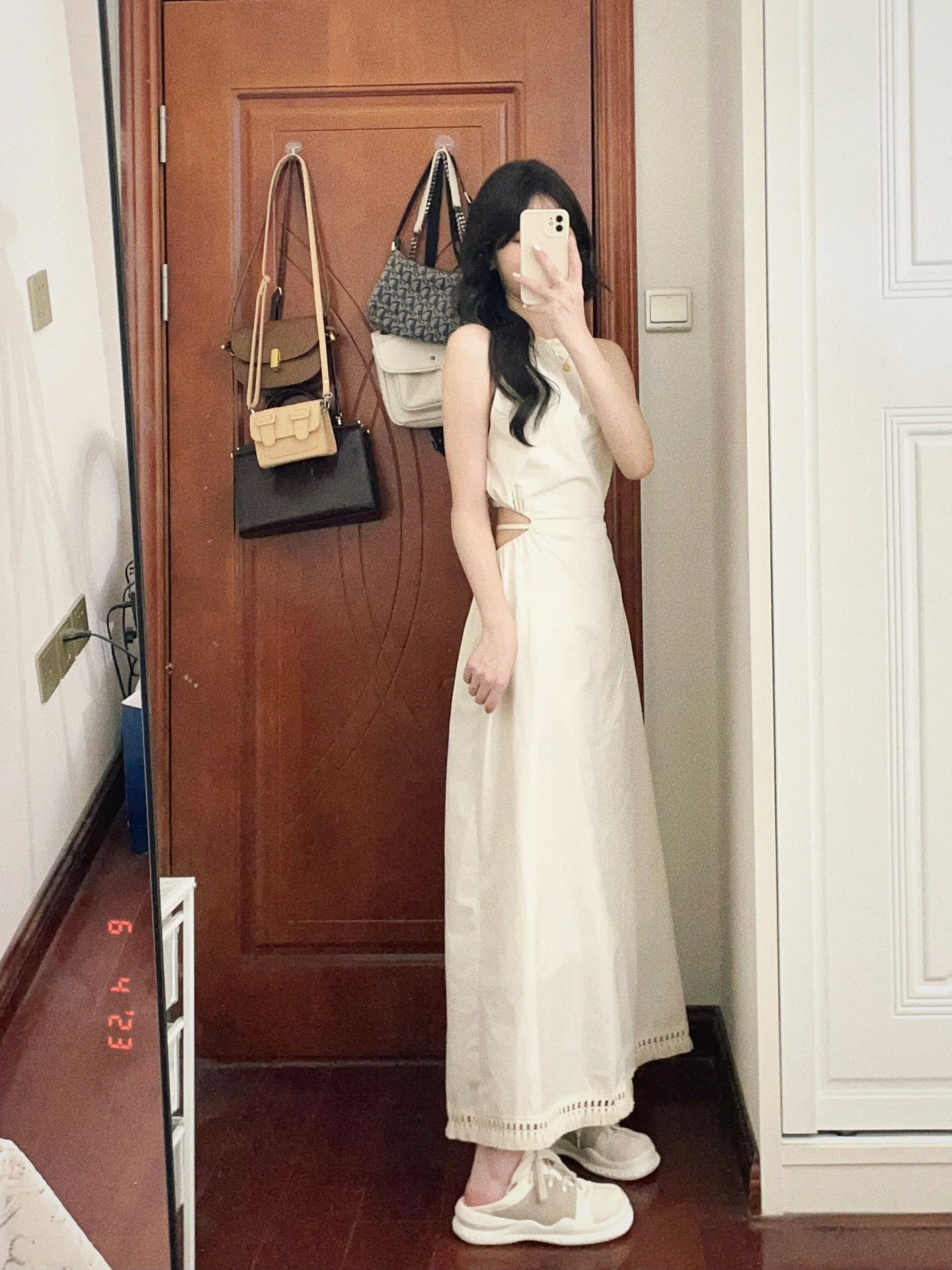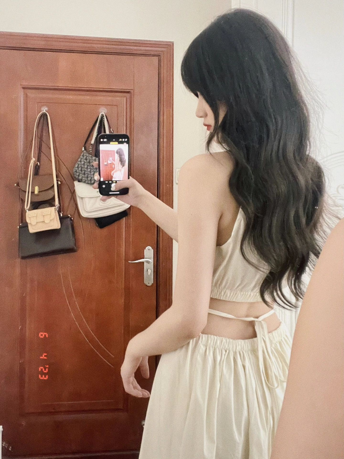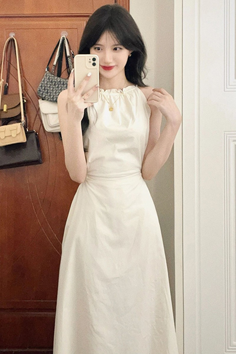 白いクロスストラップのワンピースは腰を収めて痩せている女性の夏2025の新しい気質の優しい風が首の長いスカートを掛けます。