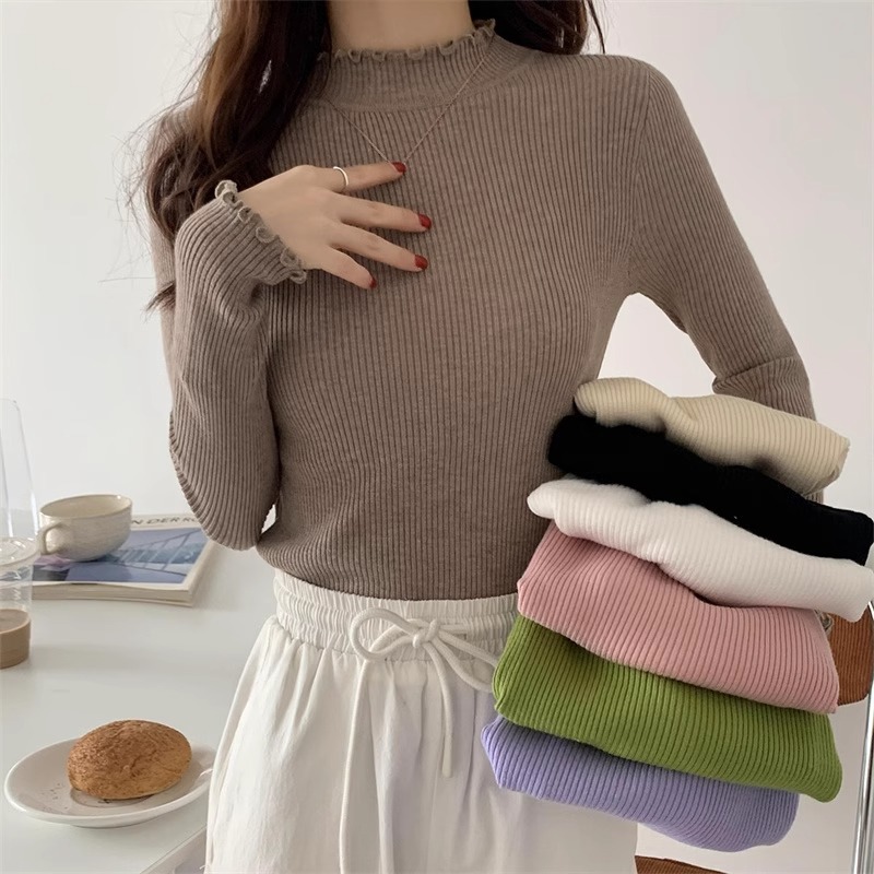 2024年の新型秋の半高襟長袖セーターの女性は木の耳元の弾力性のニットの底のシャツの上着を身に着けます。
