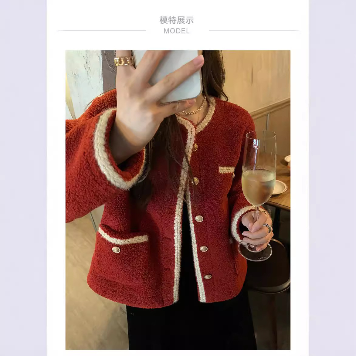 赤い小香風の子羊の毛の綿毛のコートの女性のデザイン感の小さい大衆の上着の秋冬の新型のベルベットは学生の女性を厚くします。