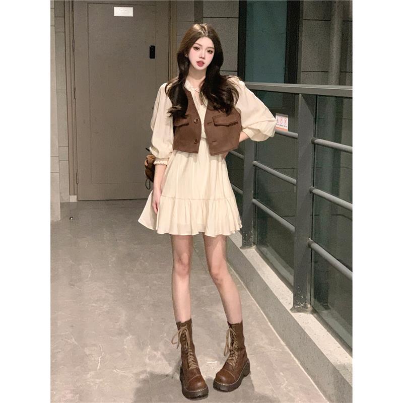 甘いクールな風の優しいフランスの気質の高級感vネックの木の耳元のワンピースの馬甲の小さい背の2セットの婦人服