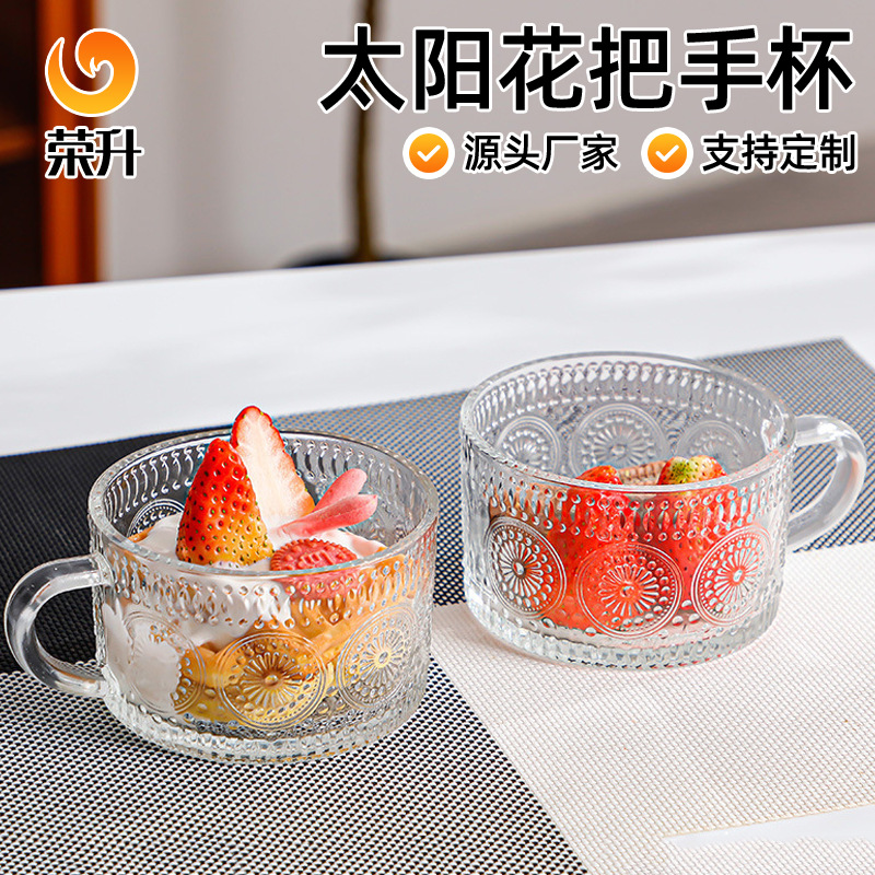 复古浮雕太阳花早餐碗高颜值玻璃杯ins带把手牛奶麦片碗家用燕麦