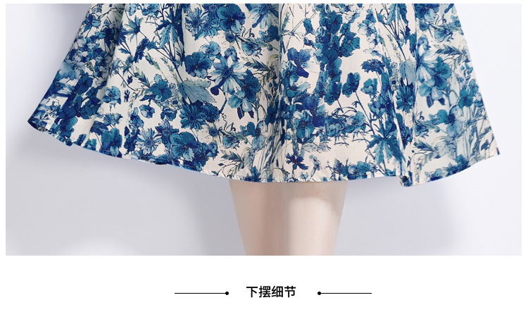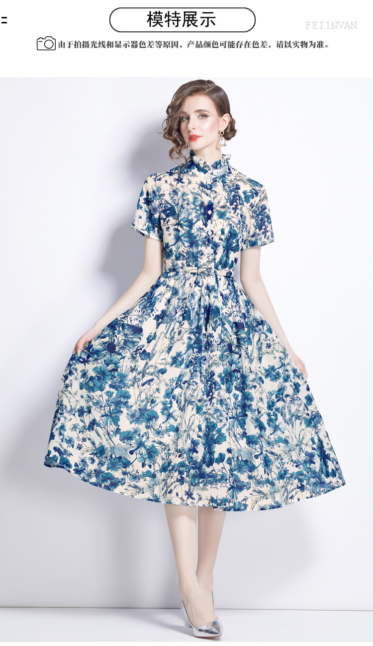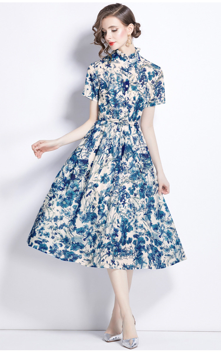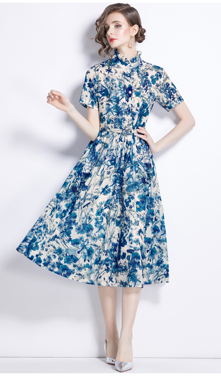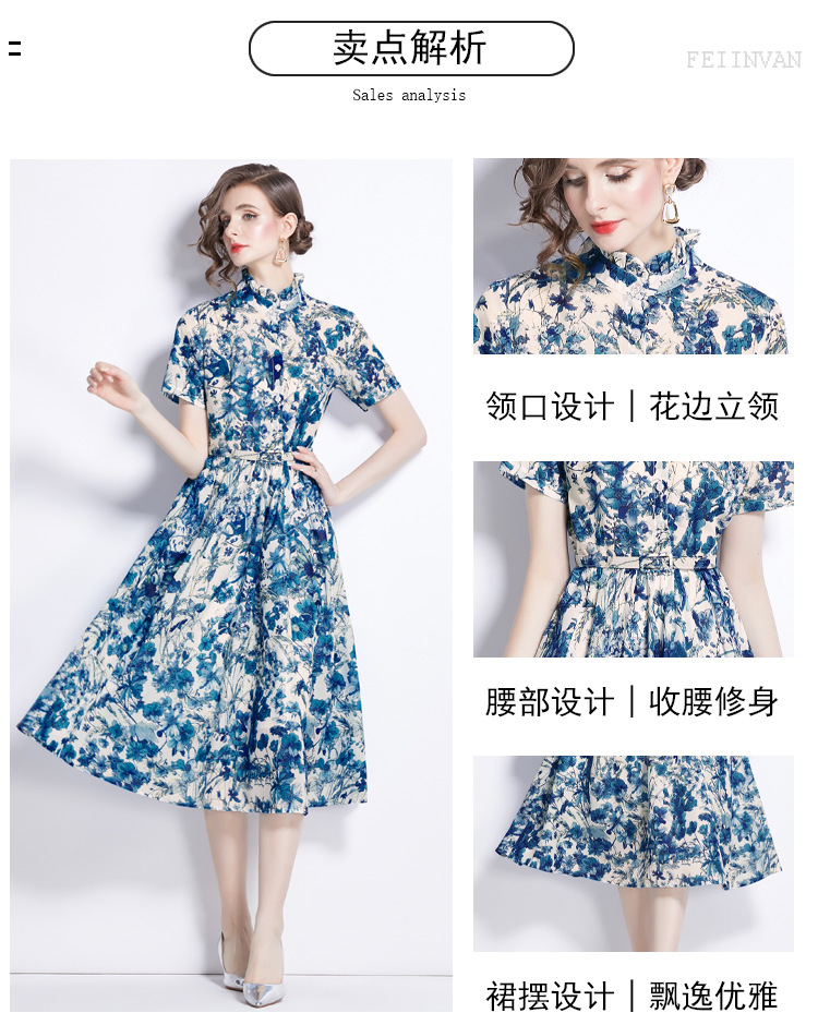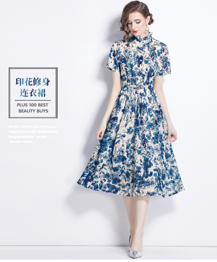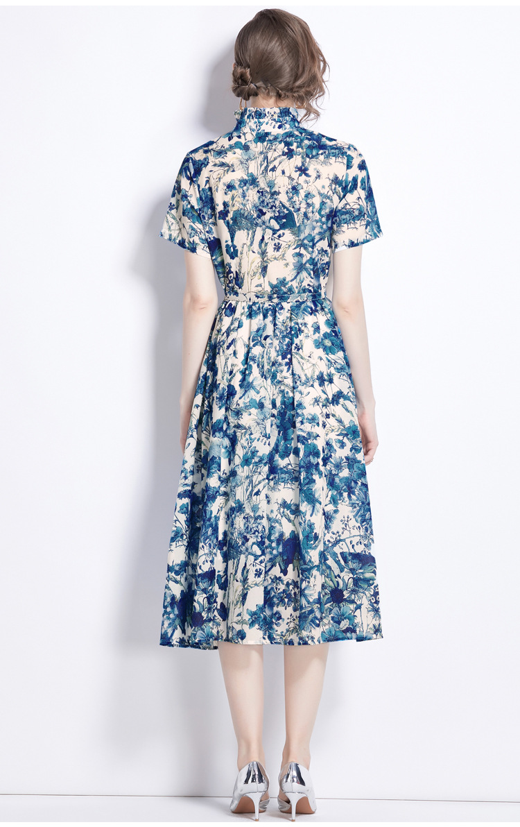 木の耳元の小さい立襟のワンピースの女性の2024夏の青花の水墨のプリントの蝶の半袖はワンピースを修理します。