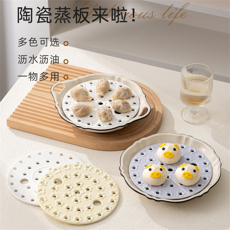 创意陶瓷蒸盘家用多功能蒸架饺子蒸格包子蒸蛋架多孔沥水沥油盘子