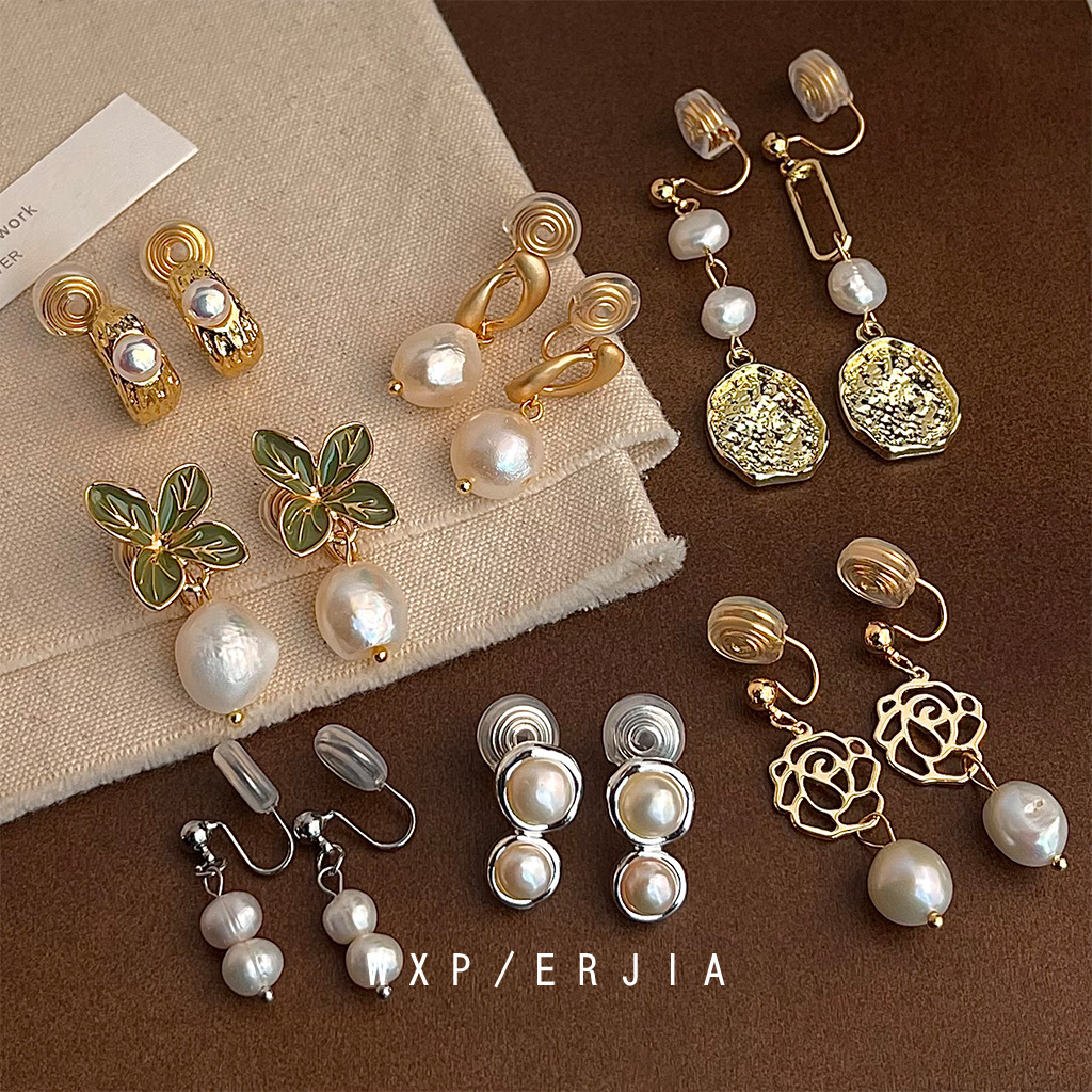 淡水パールに本金メッキを施した痛くないイヤークリップ、フレンチスタイルの軽やかな高級感、手作りのレトロな雰囲気、ノンホールピアス