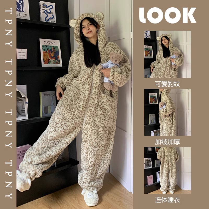 可爱卡通豹纹连帽珊瑚绒连体睡衣女款冬季2025年保暖一体式家居服