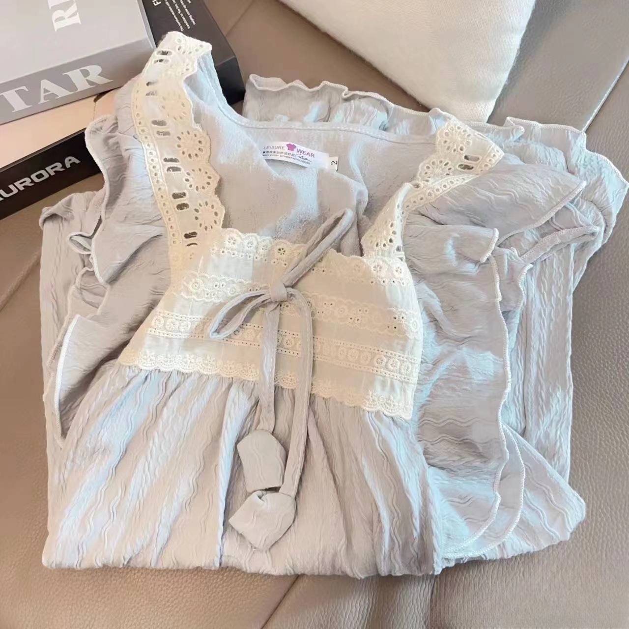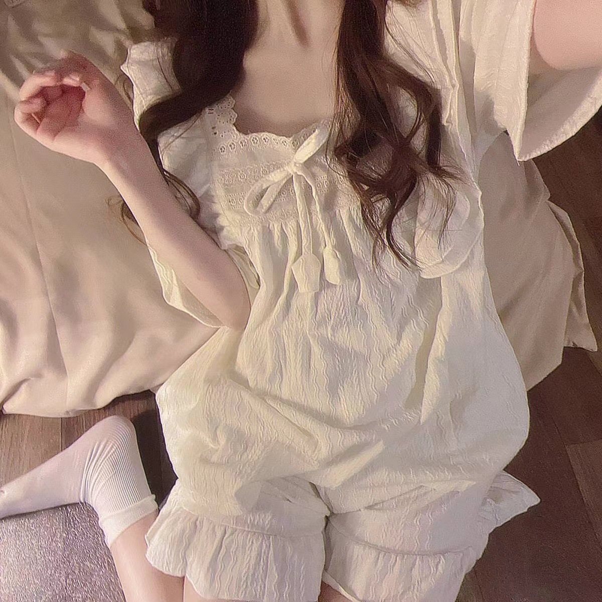 春秋ins韓国版かわいい丸首は綿のしわの布のパジャマをまねます。