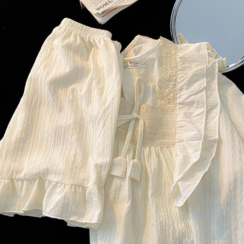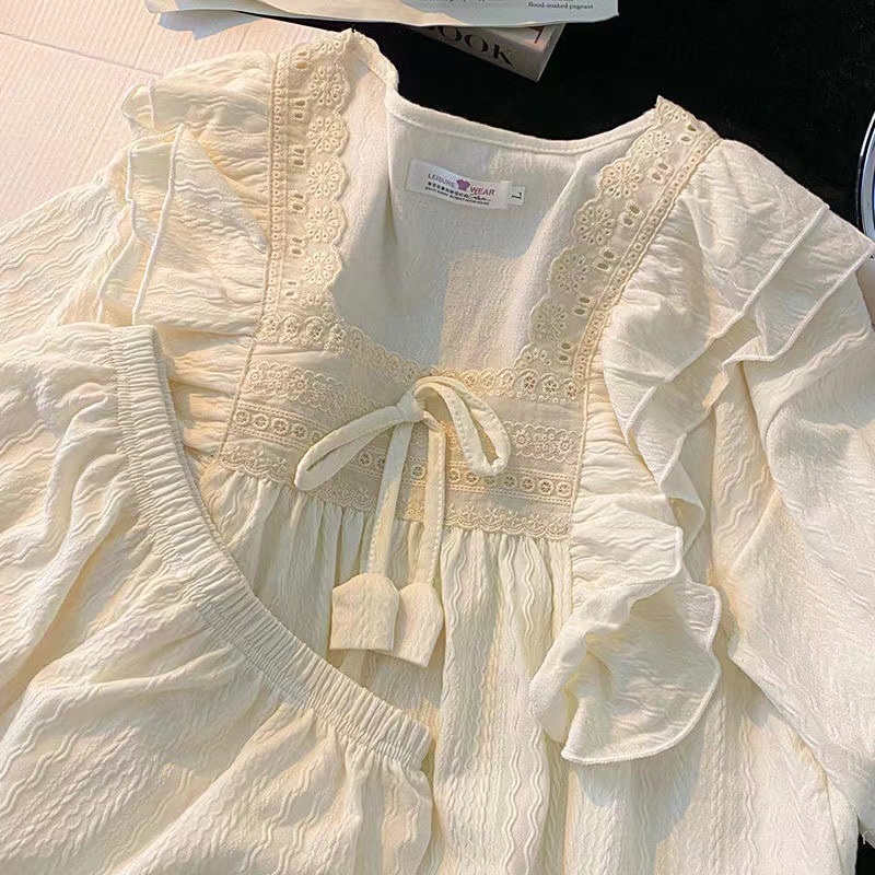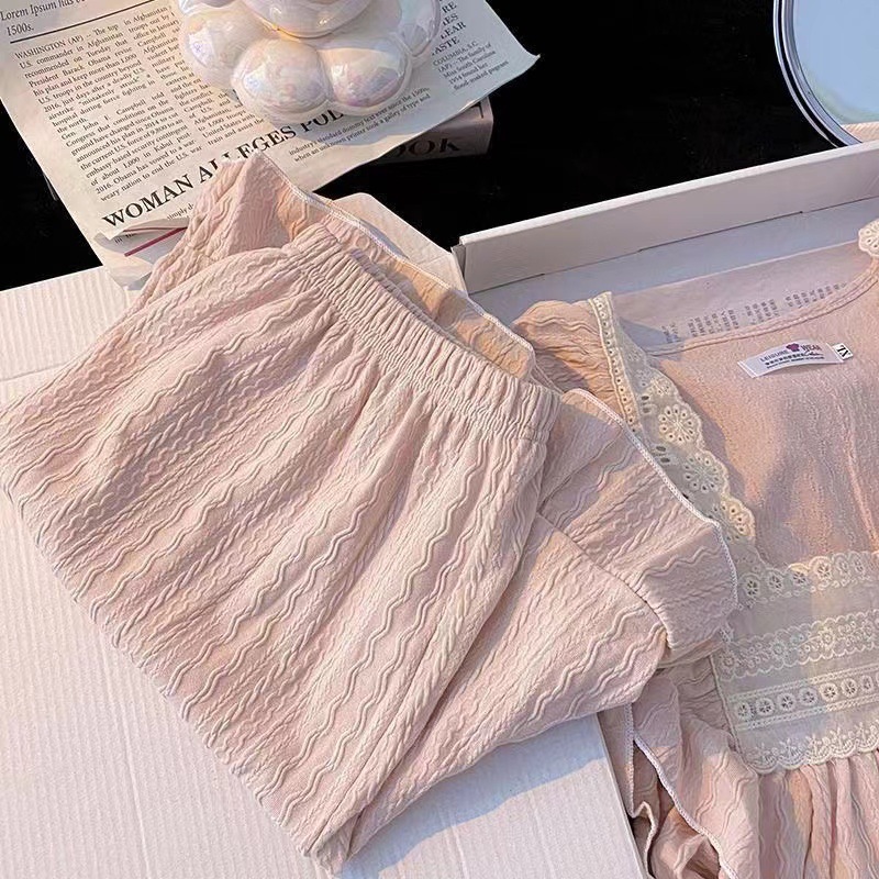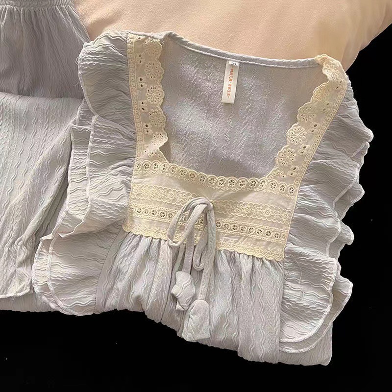 ins甜美花朵绣皱皱格长袖长裤睡衣女公主风方领可爱少女休闲套装