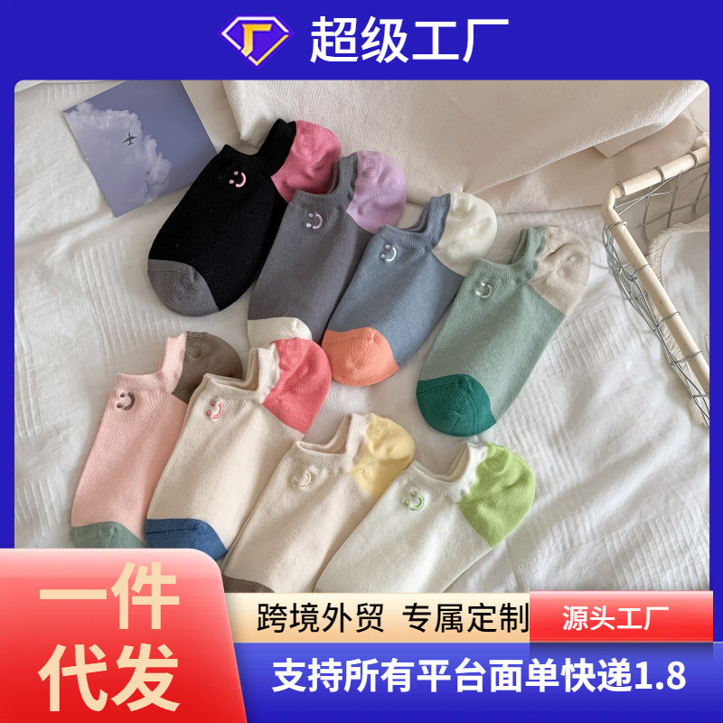 新型の25春夏の色合わせの骨のない船の靴下はシンプルで清新な笑顔の刺繍の浅い口の靴下のドーパミンが落ちないようにします。