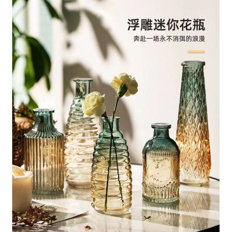 フレンチレトロ小花瓶レリーフガラス高颜値森系花瓶透明水培生け花リビング装飾花瓶