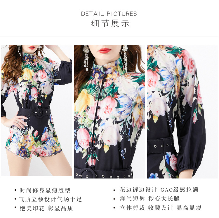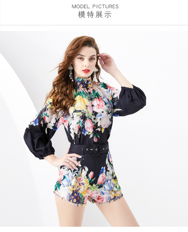 2024春夏-レトロvネック灯籠袖縮み木耳元灯籠袖シャツ + レトロ半ズボン二点セット
