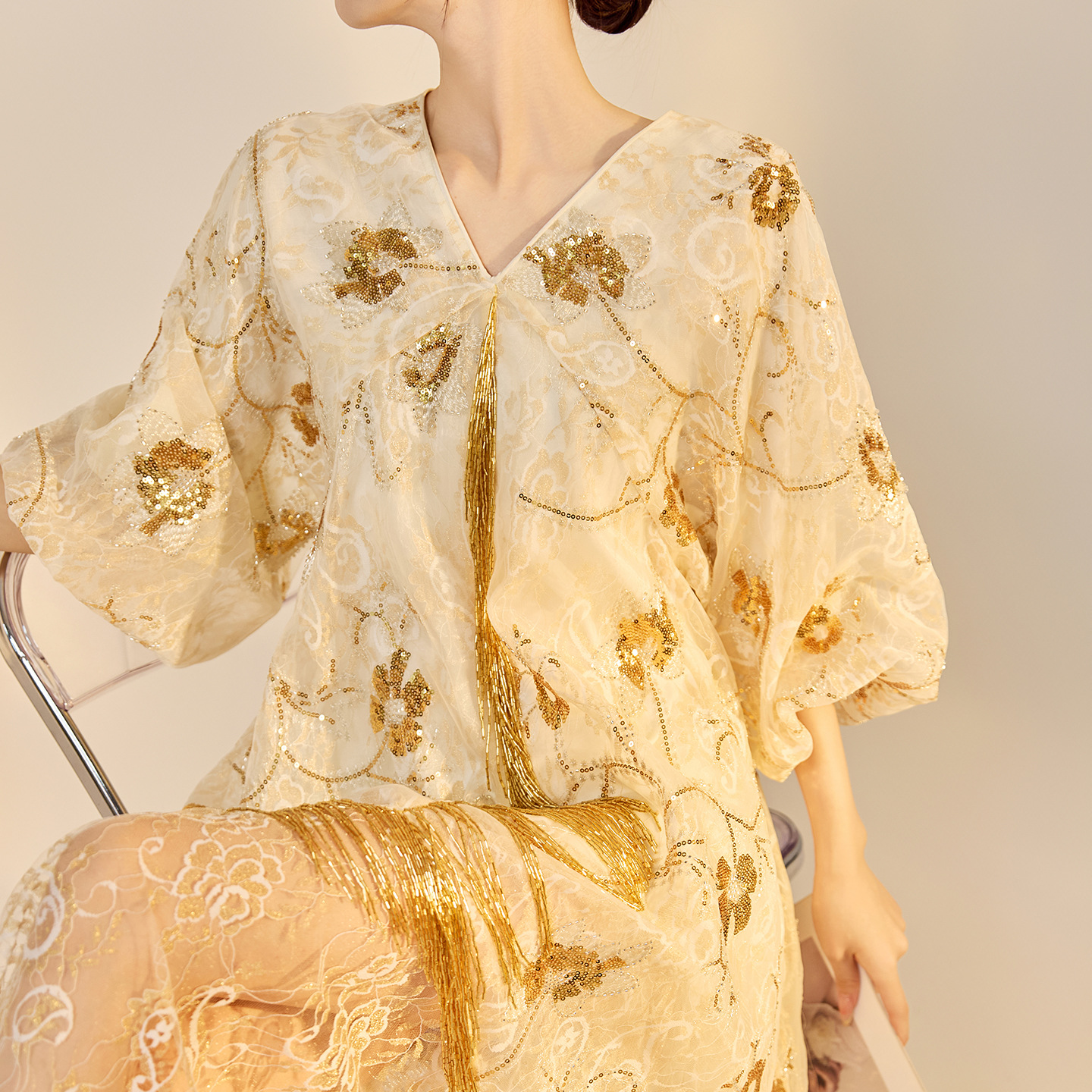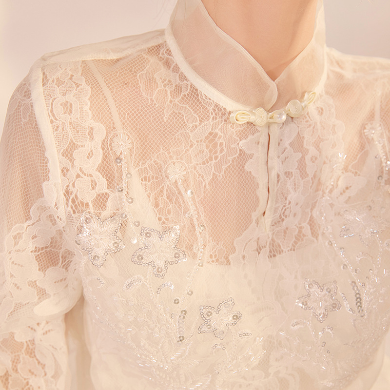 2025年秋新作 中華風 花柄刺繍 スパンコールシャツ オールドマネースタイル エレガント サテンブラウス M3003
