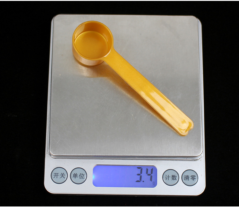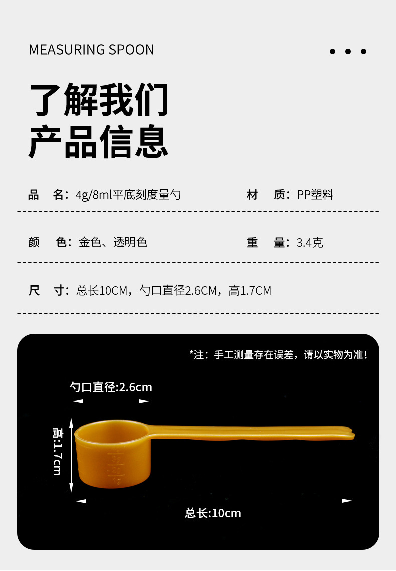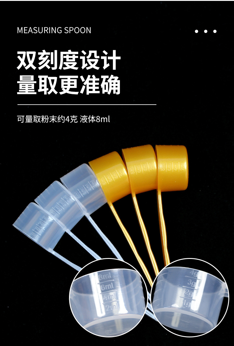 4克刻度量勺(一般粉末),(装凝胶面膜精华粉为5克一勺),带刻度。容量为8ml。