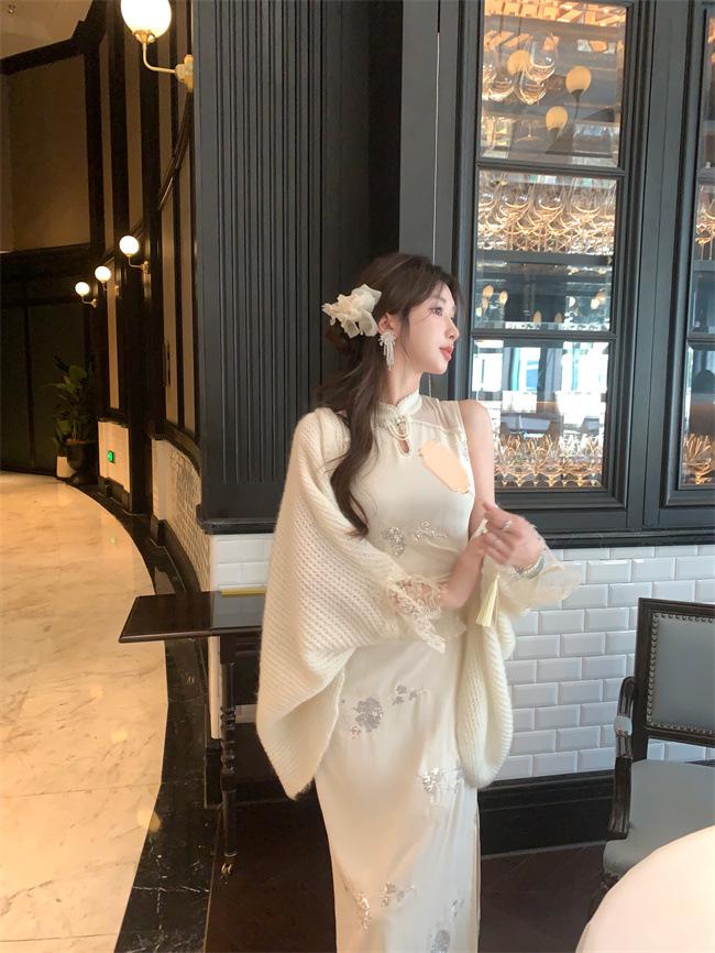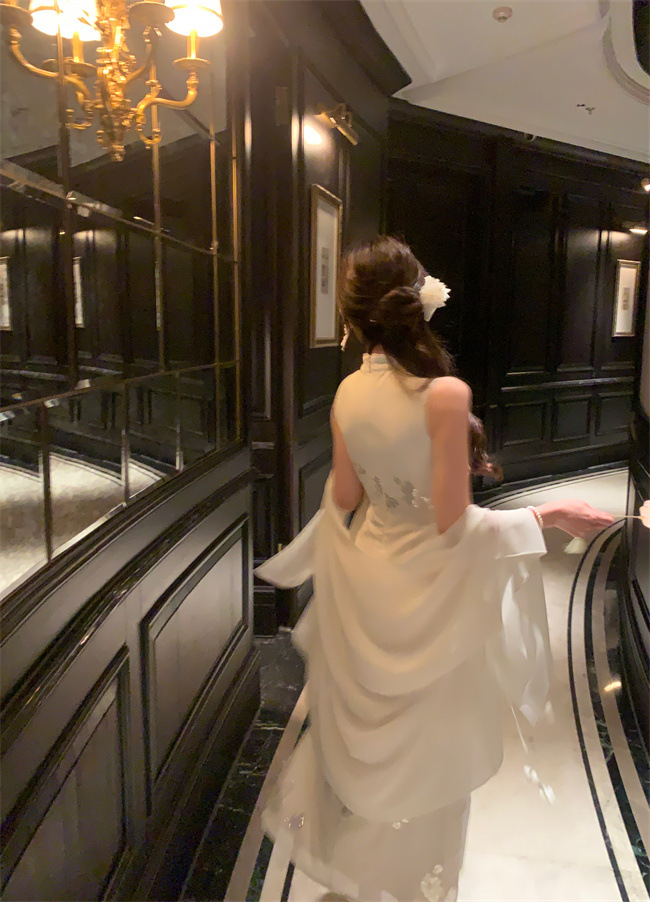 白の逆大袖長袖チャイナドレス秋冬日常改良民国大お嬢さんの絶美気質高級感