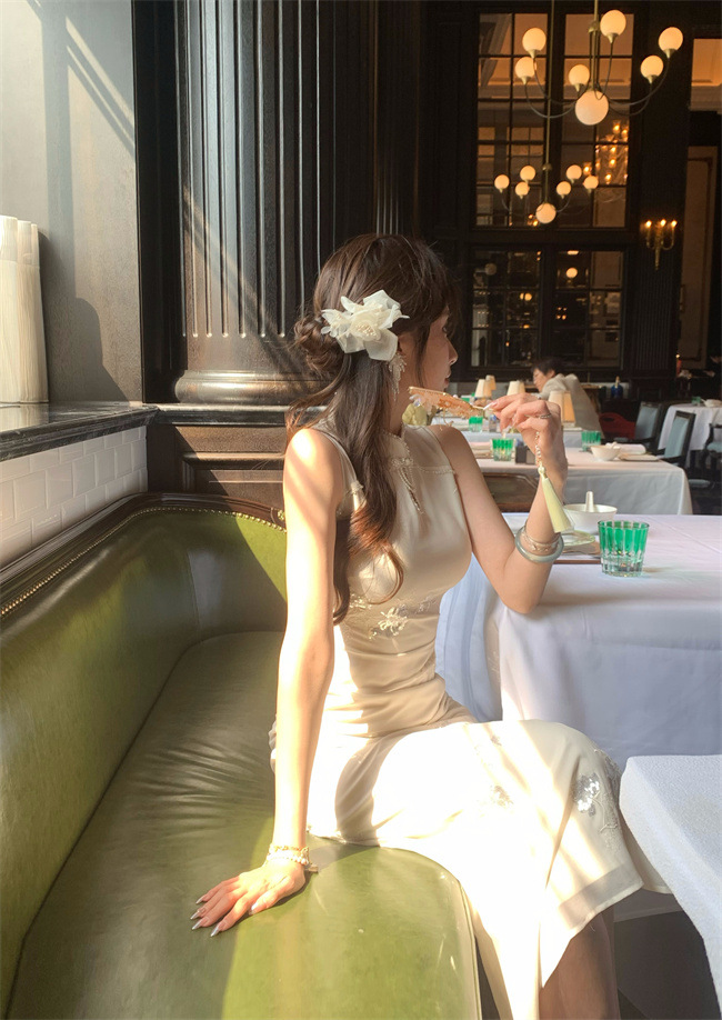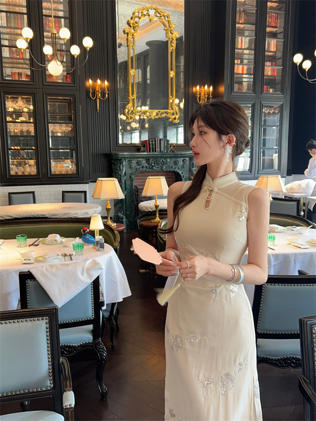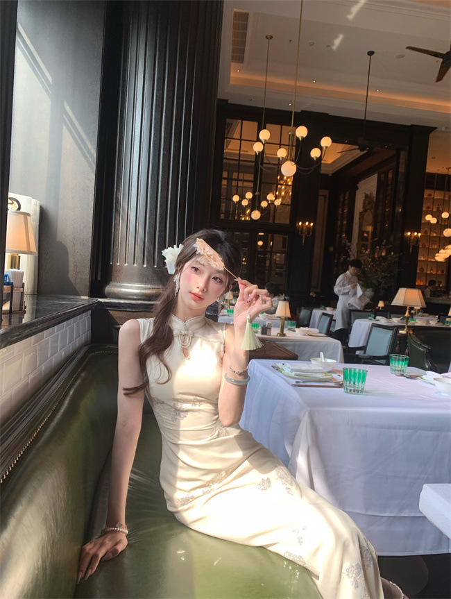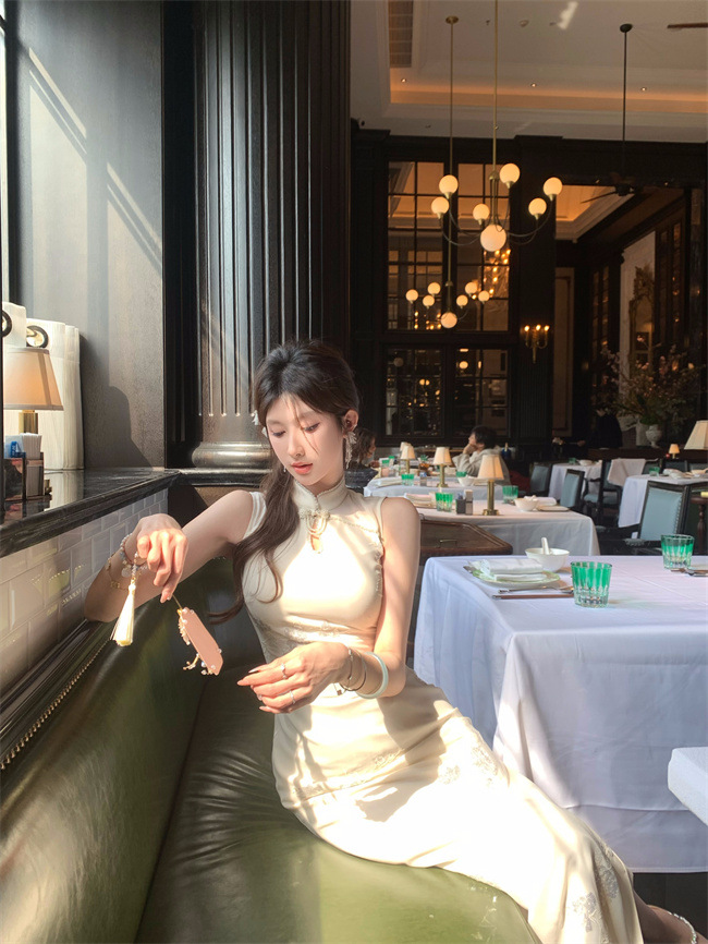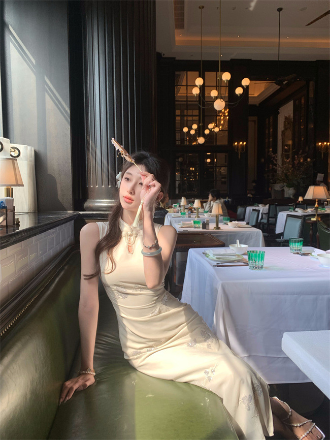 新中国式改良チャイナドレスのロングスカートはスリムな雰囲気を見せます。