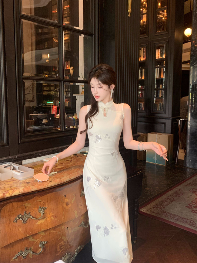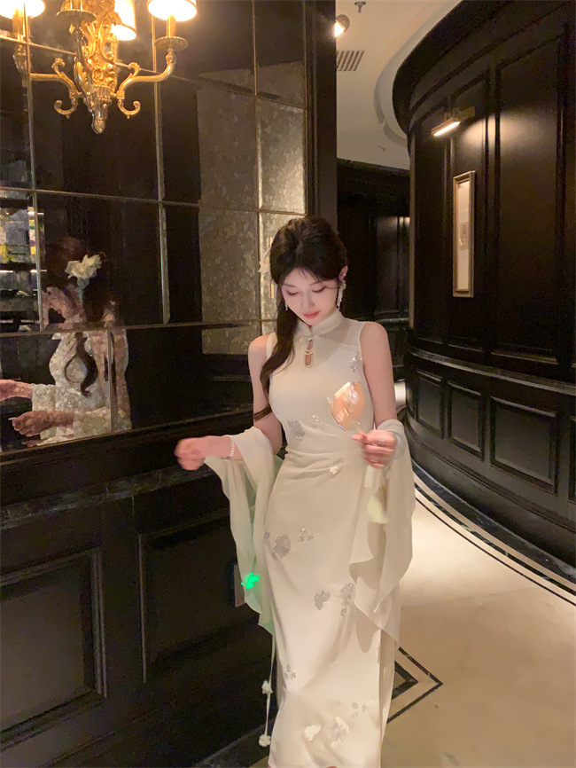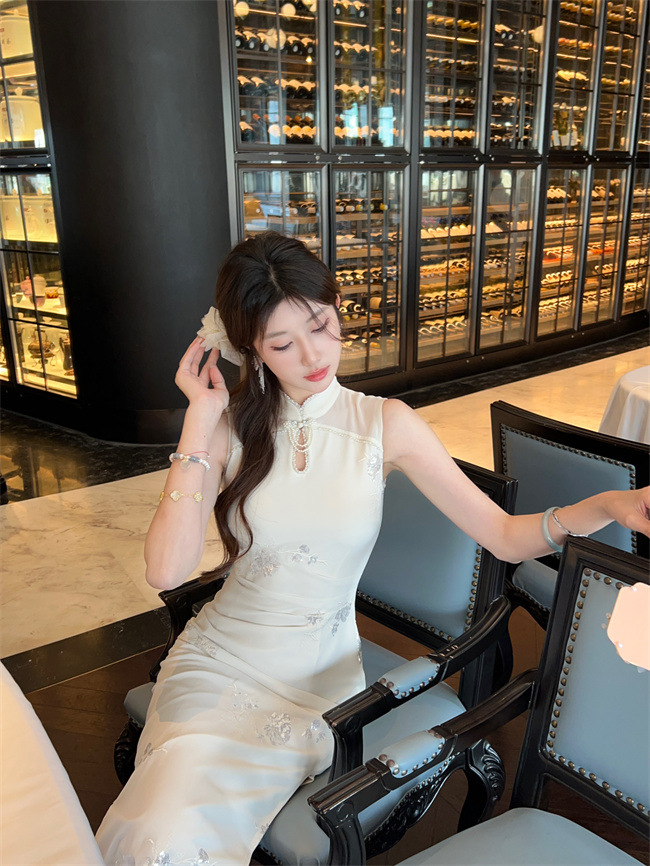 フレンチレースノースリーブのチャイナドレスのワンピースの女性服の春の夏の高級感の気質は腰を収めて身を修めてお尻の長いスカートを包みます。
