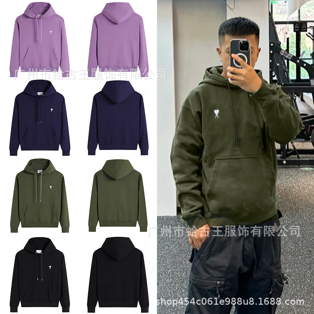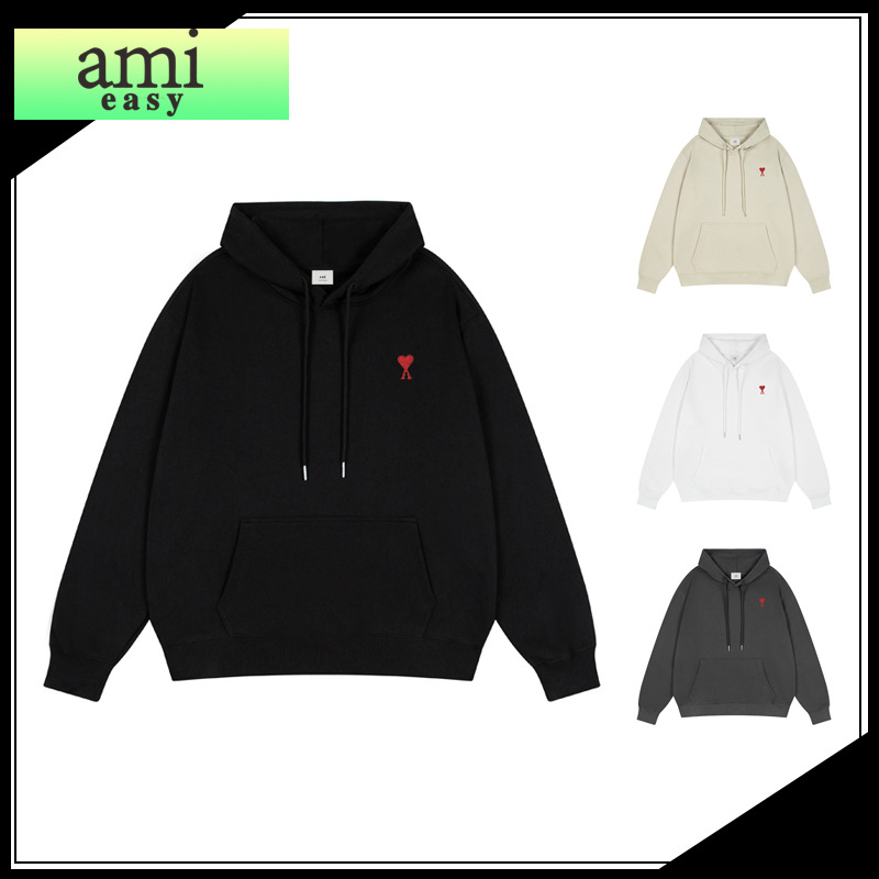 AMI&EASY 正しいバージョンのフード付きスウェットシャツ、男性用、小さなハートの刺繍、ゆったりとしたカジュアル、ファッショナブルでシンプルなトップス、秋用