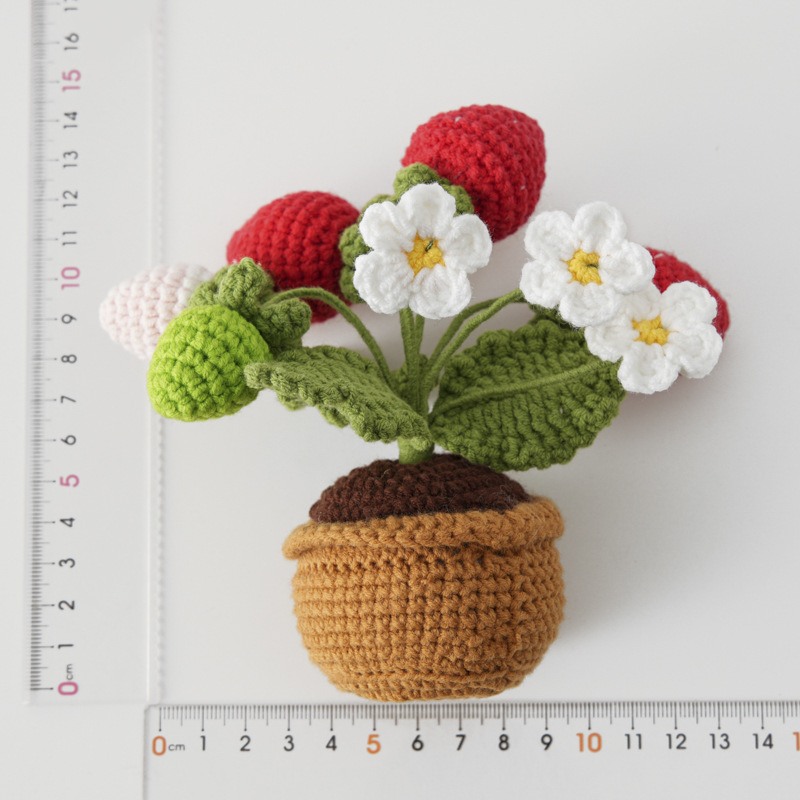 ネット赤鉤織多頭いちご麻縄毛糸鉢植え10cm植木鉢4輪赤いちご寝室ベッドの頭箱飾り