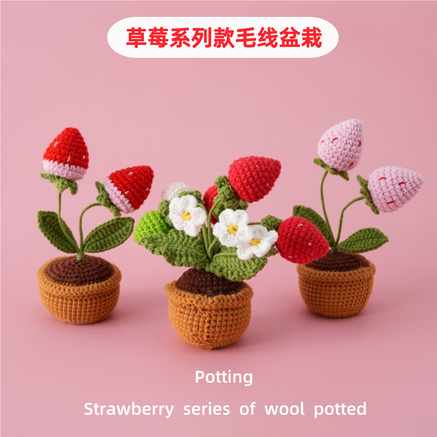 カラー 多頭イチゴ毛糸盆栽(1個),赤い二頭いちご毛糸鉢植え (1個),ピンクダブルヘッドいちご毛糸盆栽(1個)