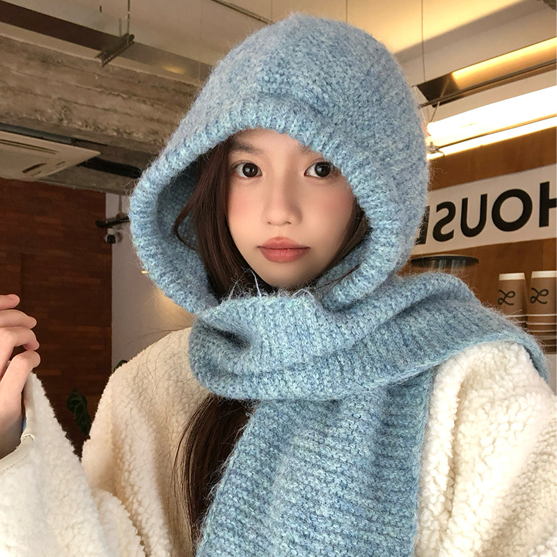 韩系蓝色针织帽子围巾一体女冬季护耳帽保暖毛线帽冬巴拉克拉法帽