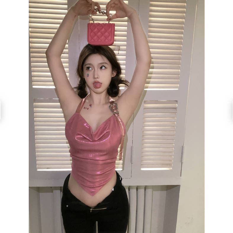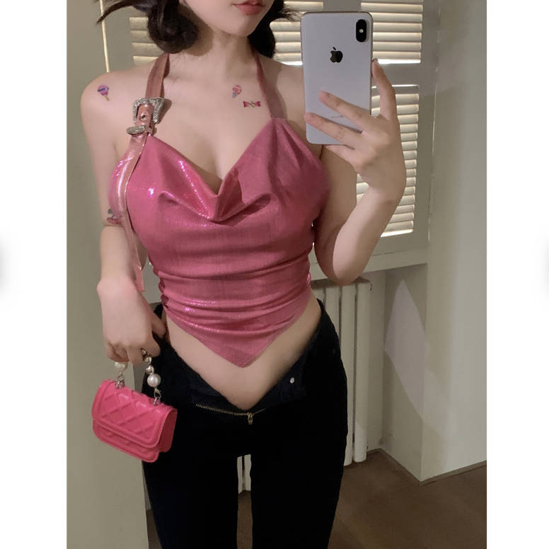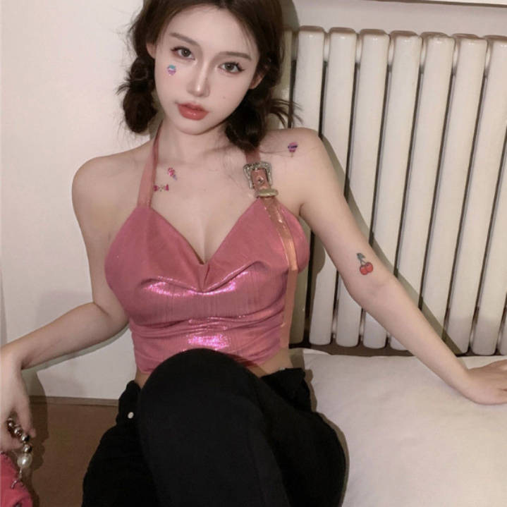 夏の新型の甘いギャルのセクシーな首のサスペンダーのベストの女性のデザイン感は背中を現して独特でやせている短い上着のファッションを現します。