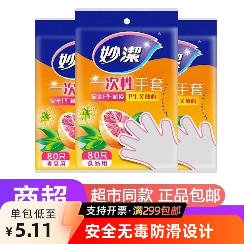妙洁一次性手套加厚款透明塑料食品级家用PE薄膜烘焙餐饮厨房专用