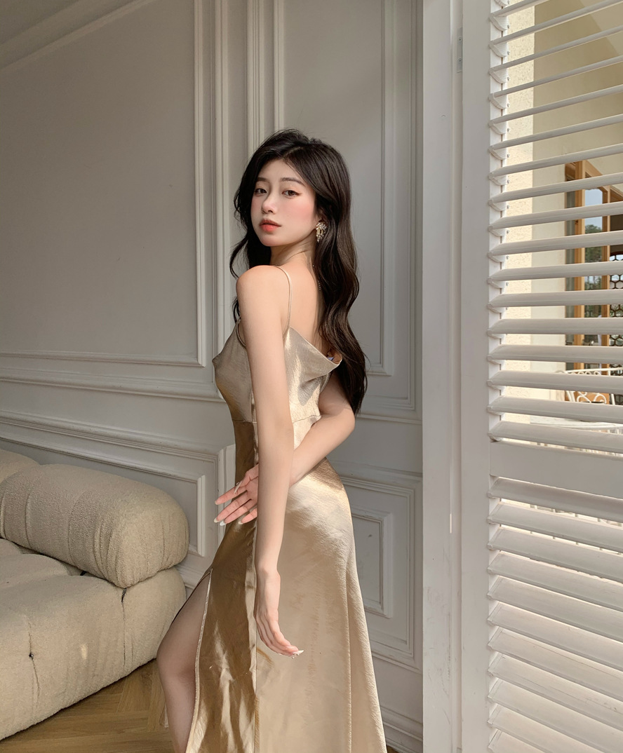 フランス風の気質のサテンの襟のサスペンダーのワンピースの女性の夏の新型の純粋な欲の風はフォークを開けて腰を収めてやせている長いスカートを現します。