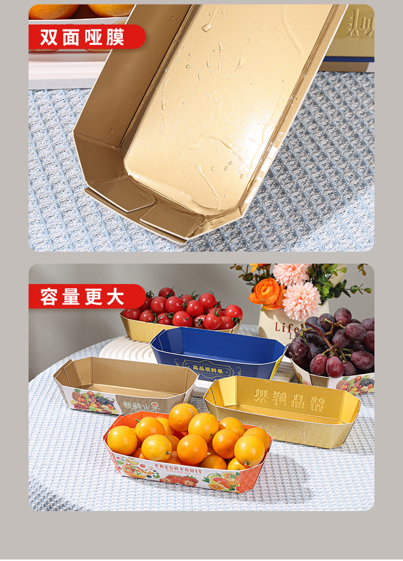 使い捨てフルーツボックス、高品質舟形フルーツトレイ、金色の梱包箱、チェリーディスプレイフルーツ包装カートン