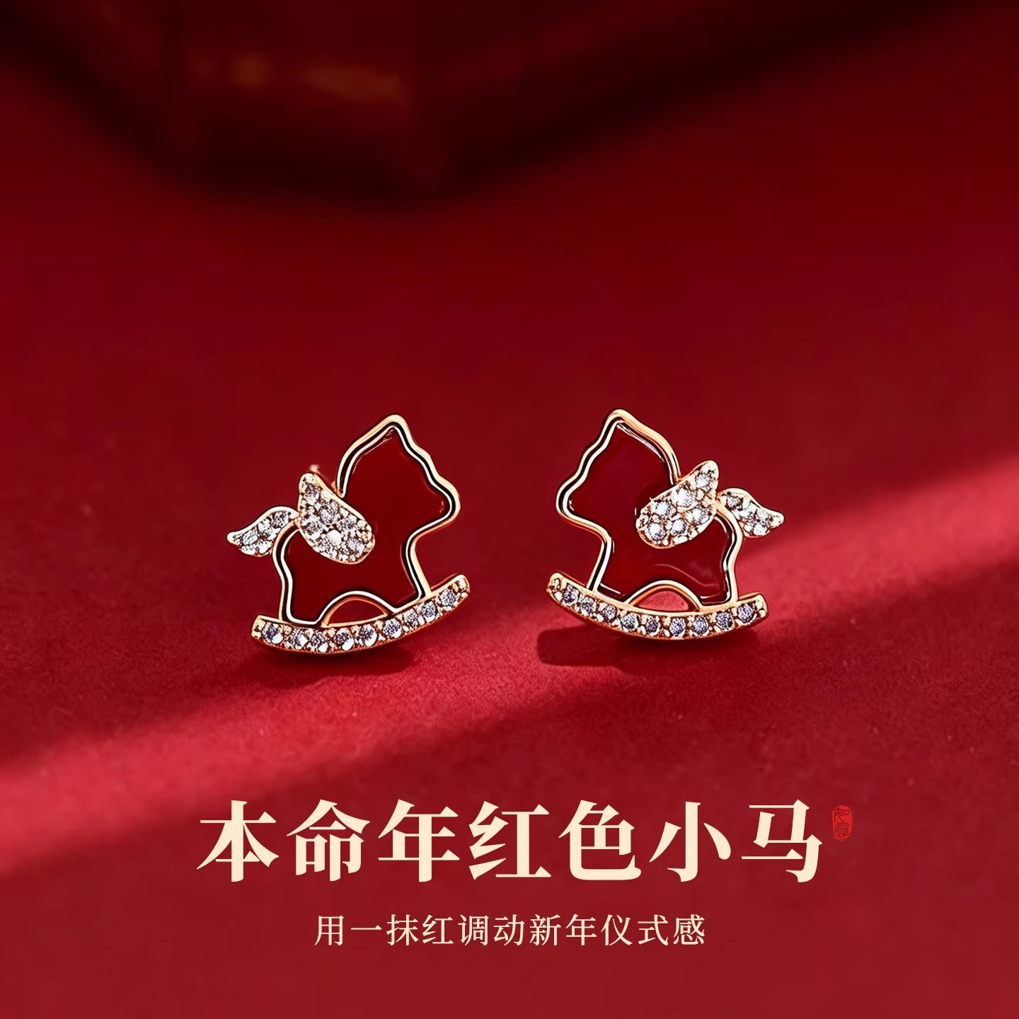 18k真金电镀银针植绒小马珍珠耳钉轻奢高级感耳环本命年红色耳饰