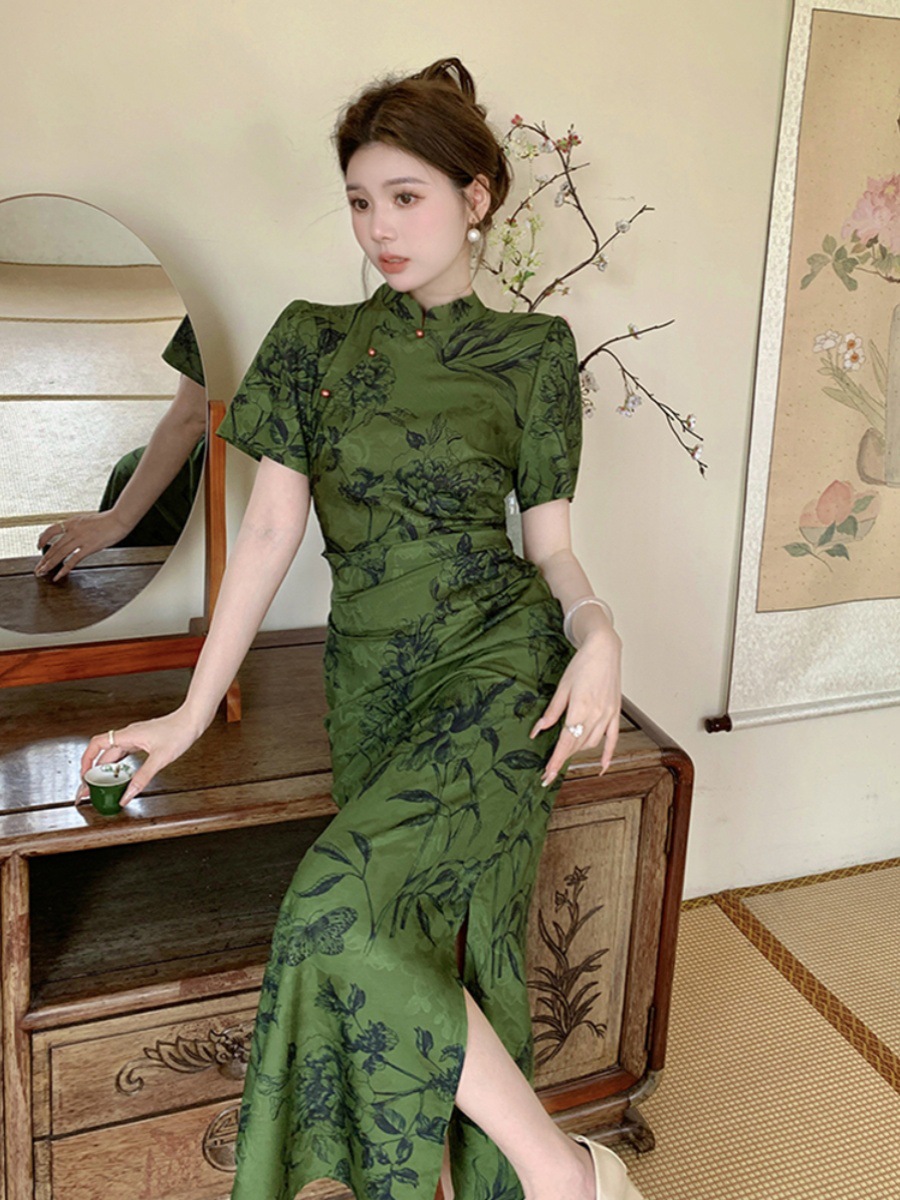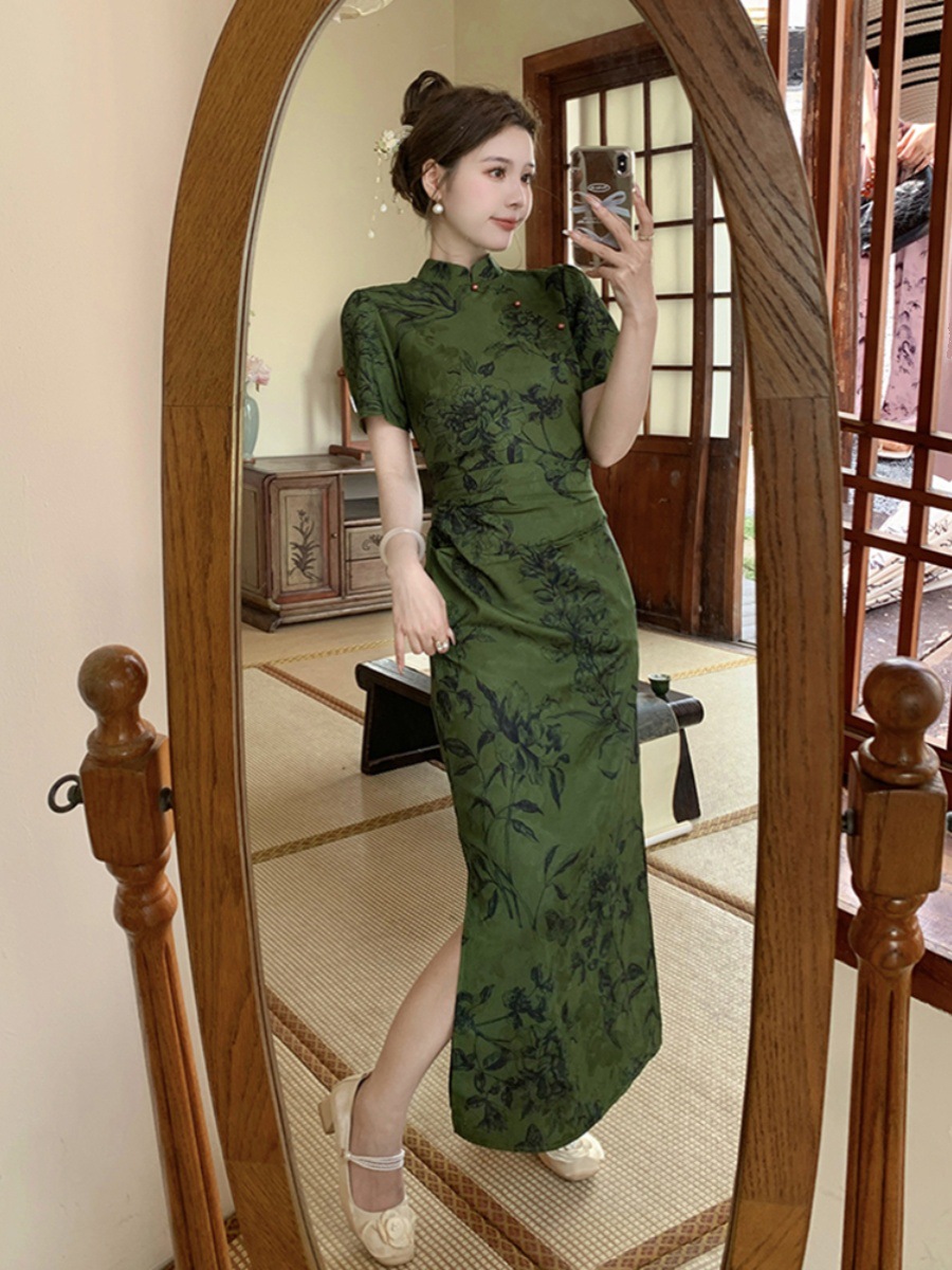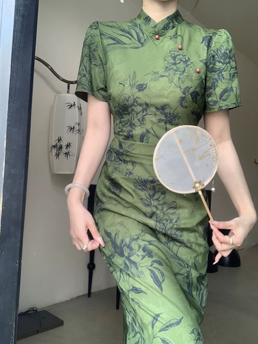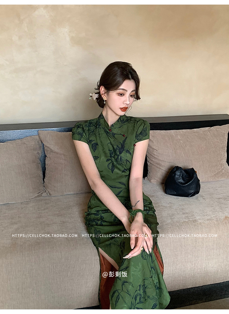 緑の新しい中国式のチャイナドレスは若いタイプの日常ジャカードの小さい背の高級感の国風のワンピースの女性の秋を改良します。