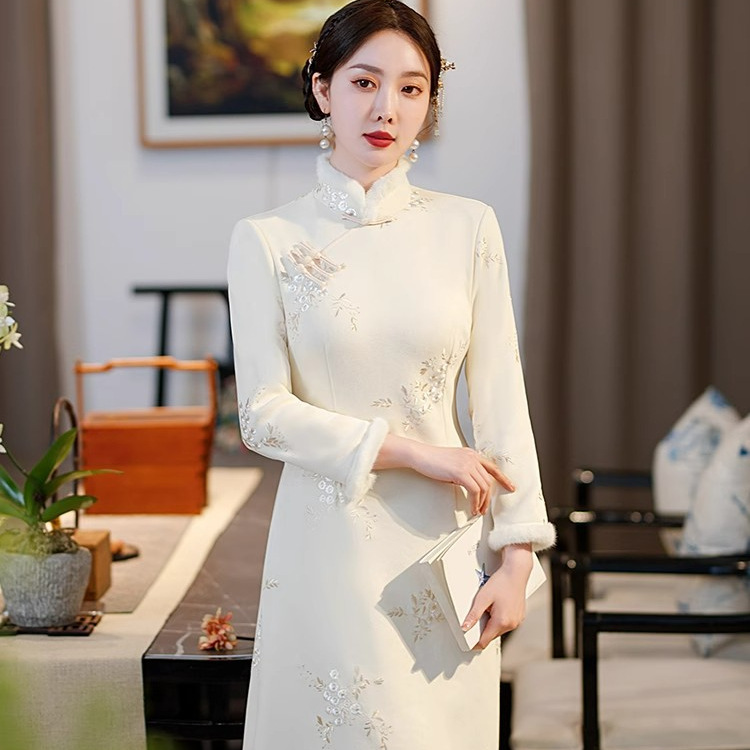 抹茶2025年冬新作改良版旗袍刺繍入り裏起毛J厚手毛皮襟付き女性用新中式スカート