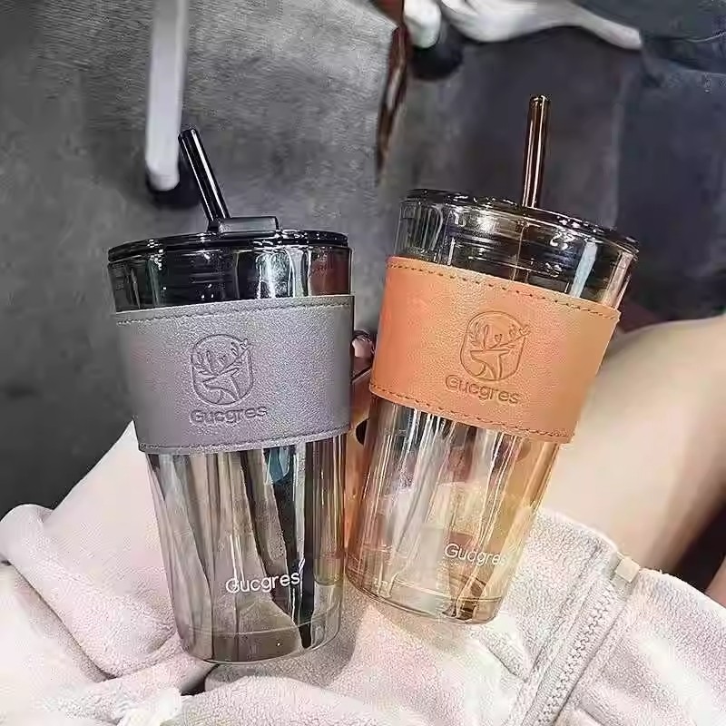 ネット赤コーヒーカップグラスカップ皮付きカップストローカップ高颜値ギフトカップ卸売りコーヒーカップ