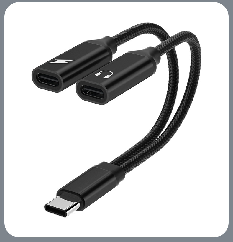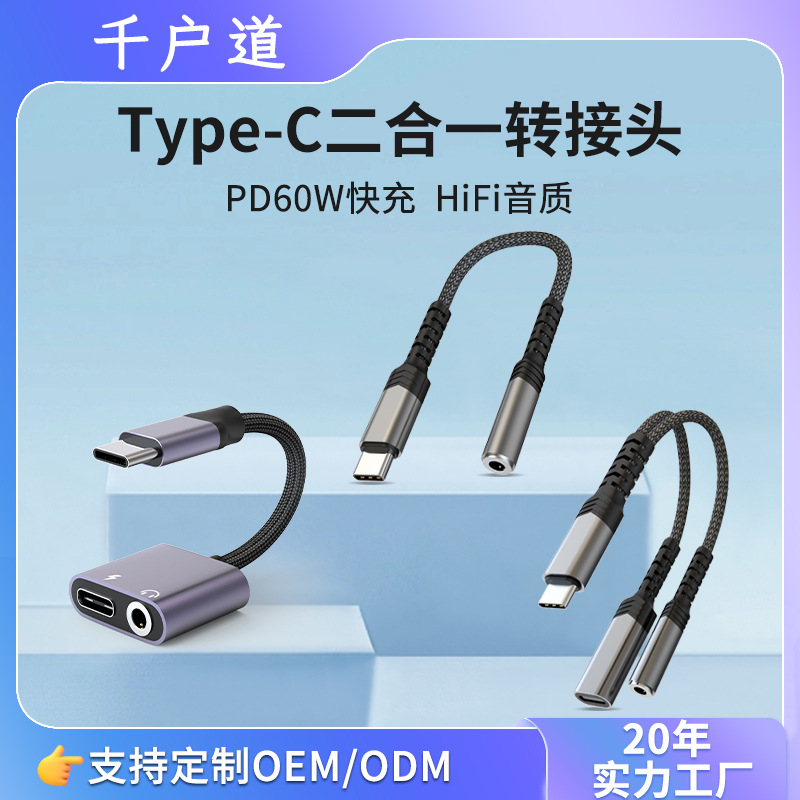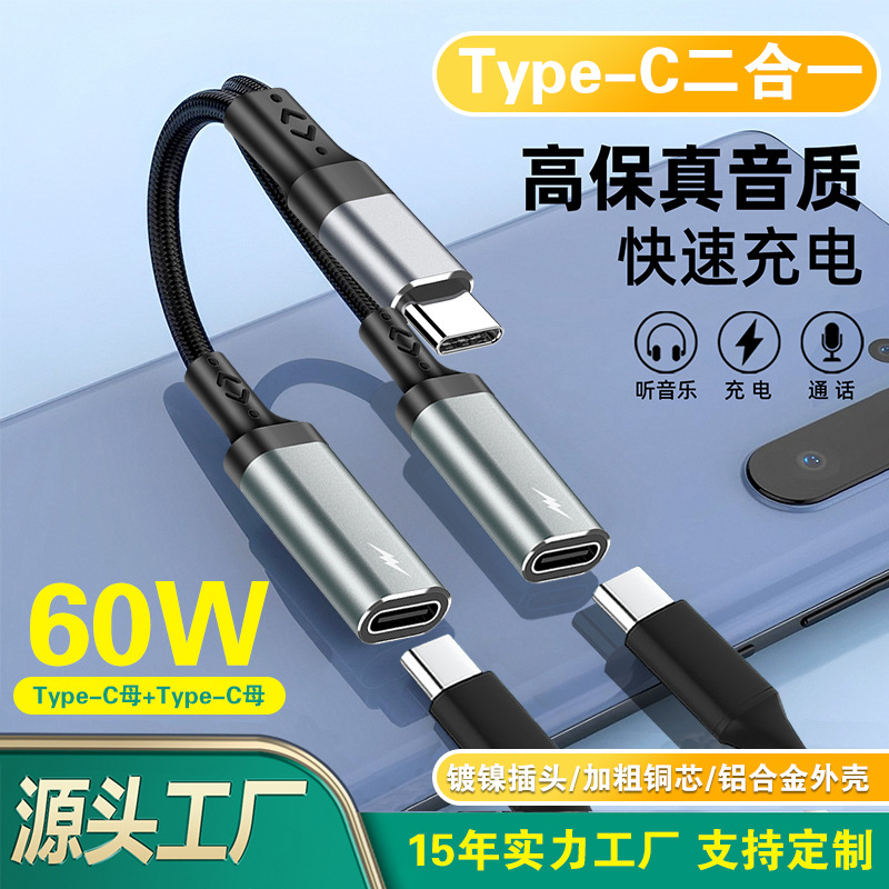跨境新品typec转接头手机平板通用60W充电听歌二合一 typec转接头