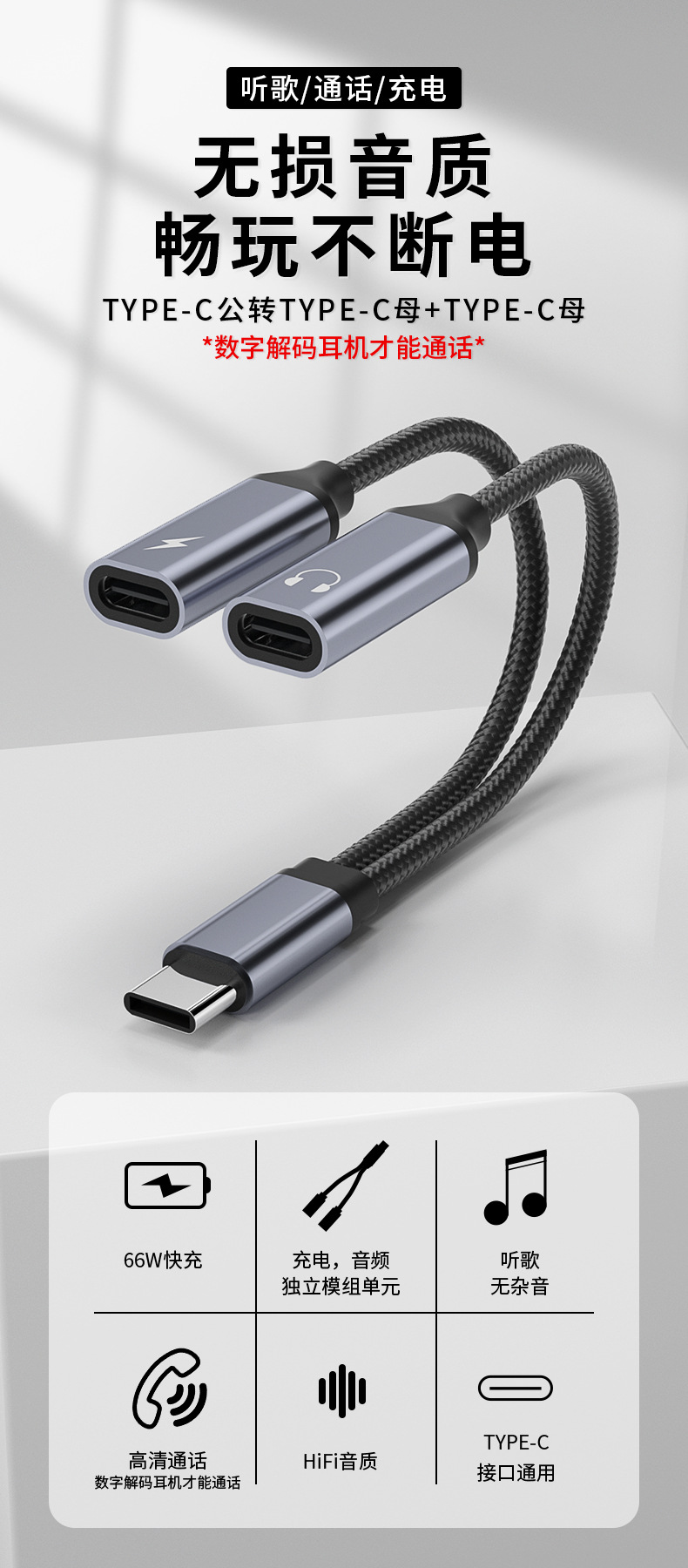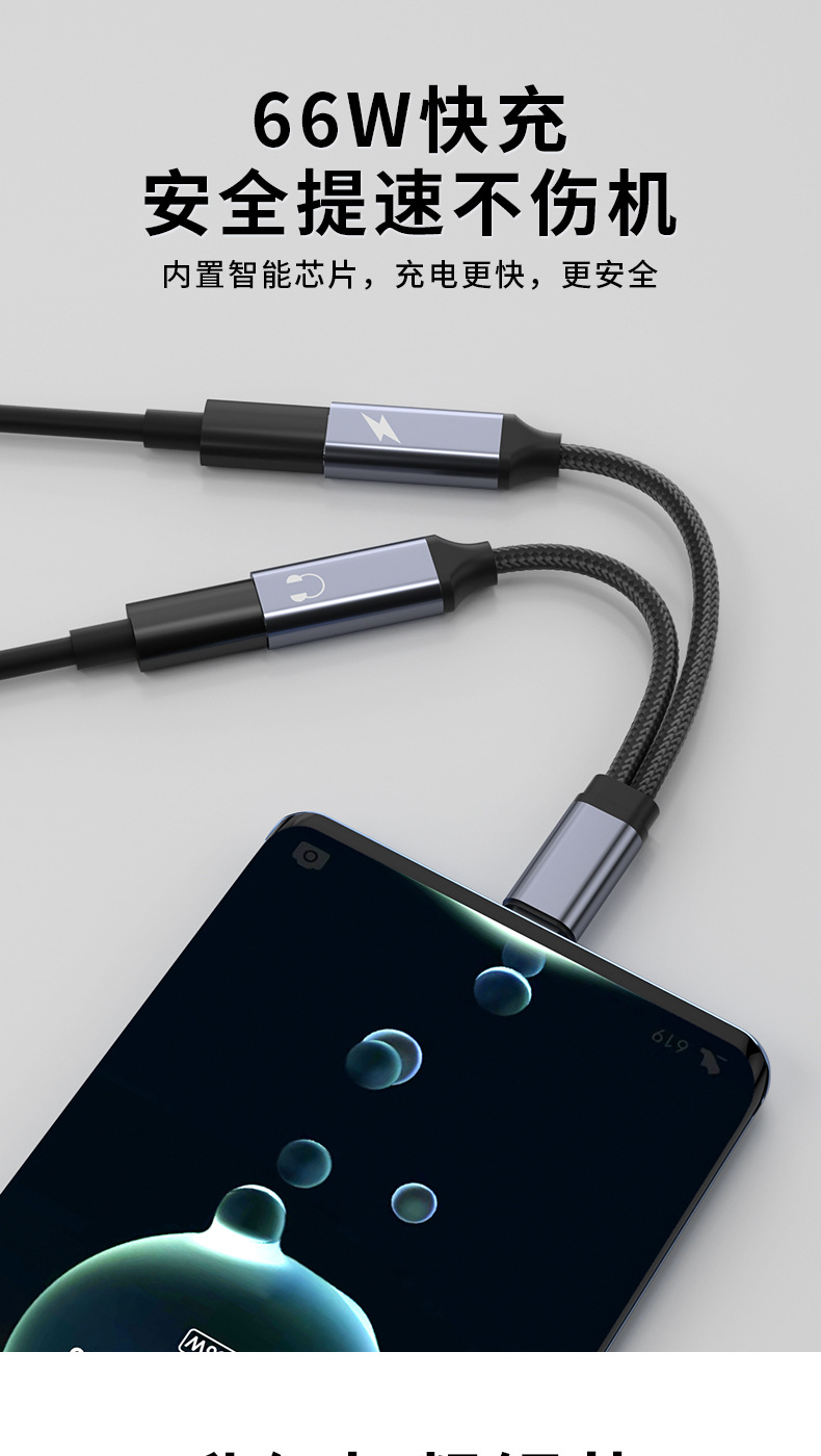 66w急速充電typecイヤホン変換ヘッドセット通話聴歌充電二合一変換ヘッドダブルTYPE-Cオーディオライン