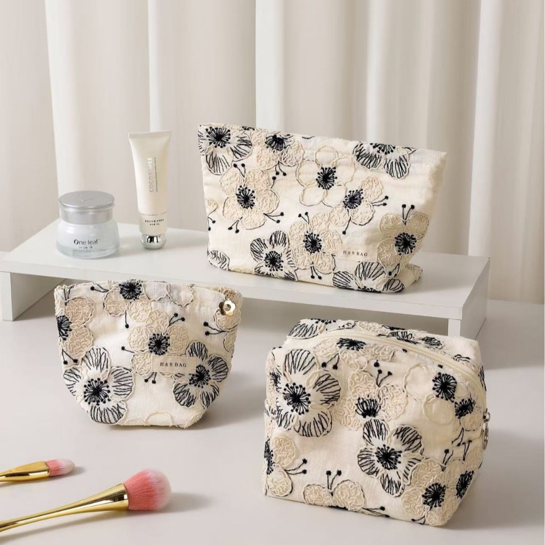 フランスのシンプルな文学綿とリネンの刺繍花化粧品袋ポータブル大容量手持ち収納袋化粧枕袋