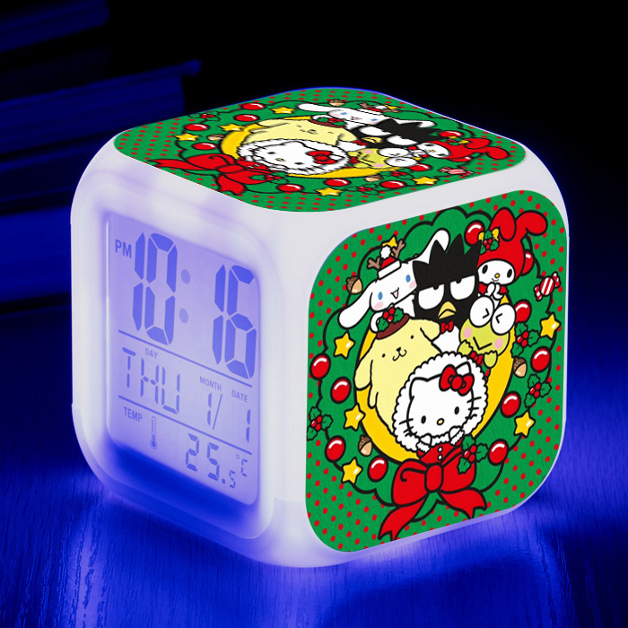 新しいサンリオの全家の福の漫画の図案の七色の変色の小さい目覚まし時計のアイデアの電子の静かな単一の四方の時計を供給します。