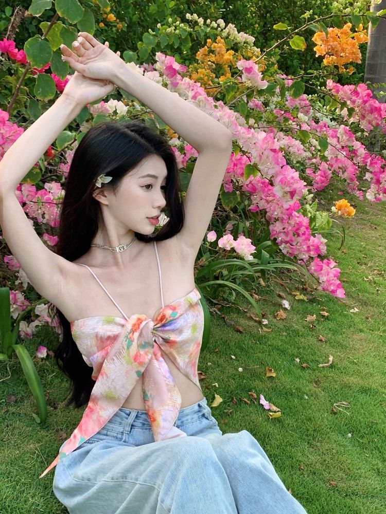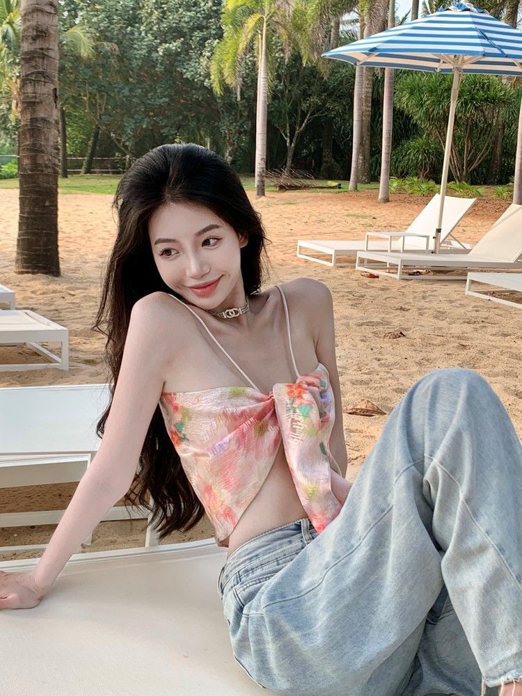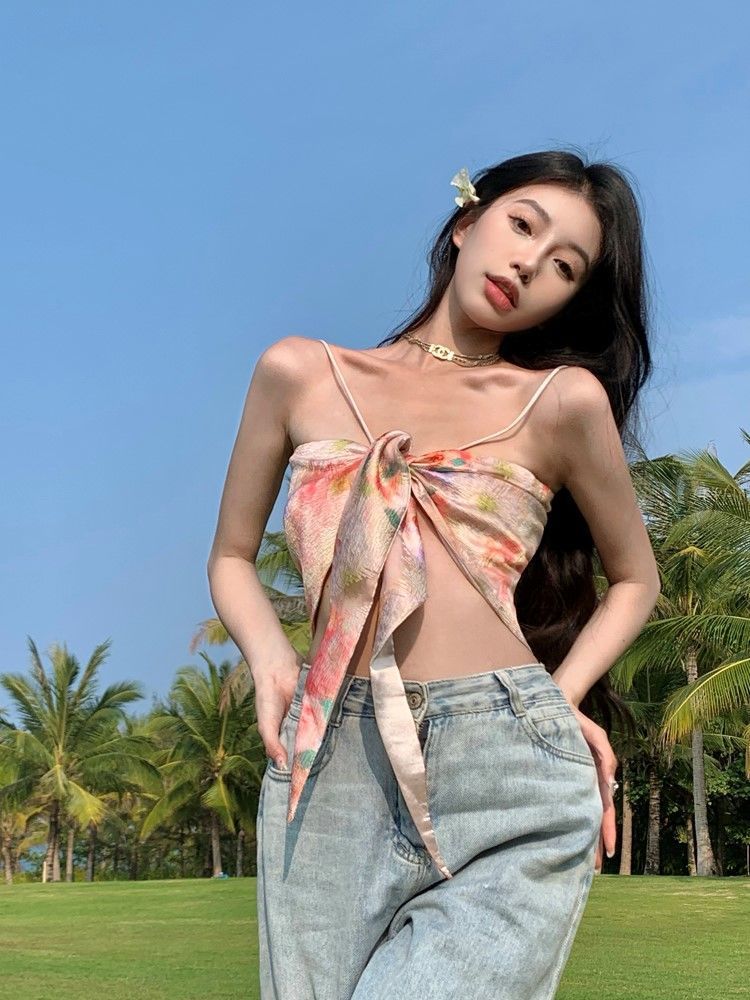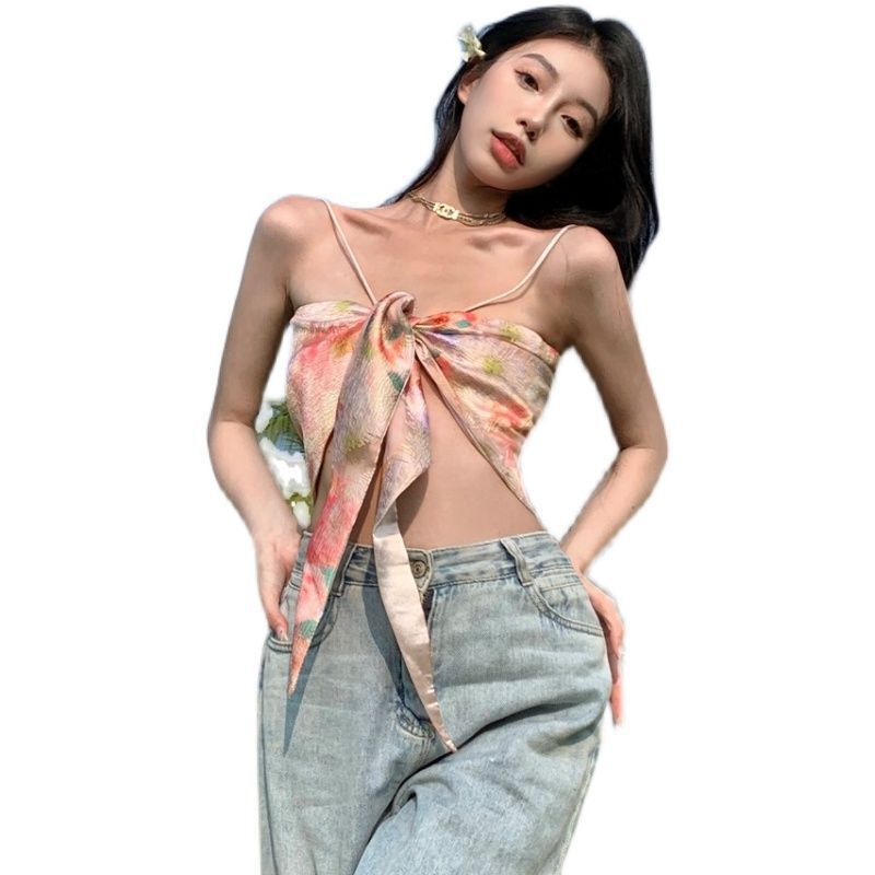 フランスのレトロなギャルのセクシーなストラップのベストの女性の夏の2024の新型のデザイン感は背中を現してやせている短い上着を現します。