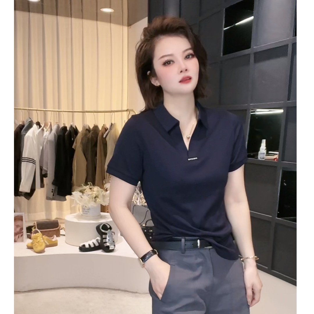 ドロップシッピング Tシャツレディース半袖新しいスタイルは肉をカバーし、スリムに見えます、ゆったりと多用途なポロカラーの夏用無地ママトップス