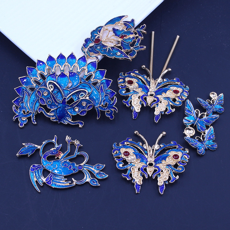 合金アクセサリーアクセサリー模造焼藍景泰藍滴油蝶鳳凰花髪冠ヘアピンdiy古風材料