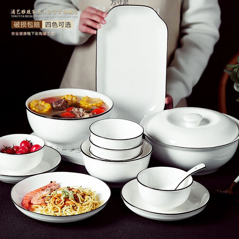 シンプルな黒い線の碗の皿のセットの碗の皿の家庭用陶磁器の食器の料理の皿のご飯の碗の魚の皿の箸のスプーンのスープの碗の組み合わせ