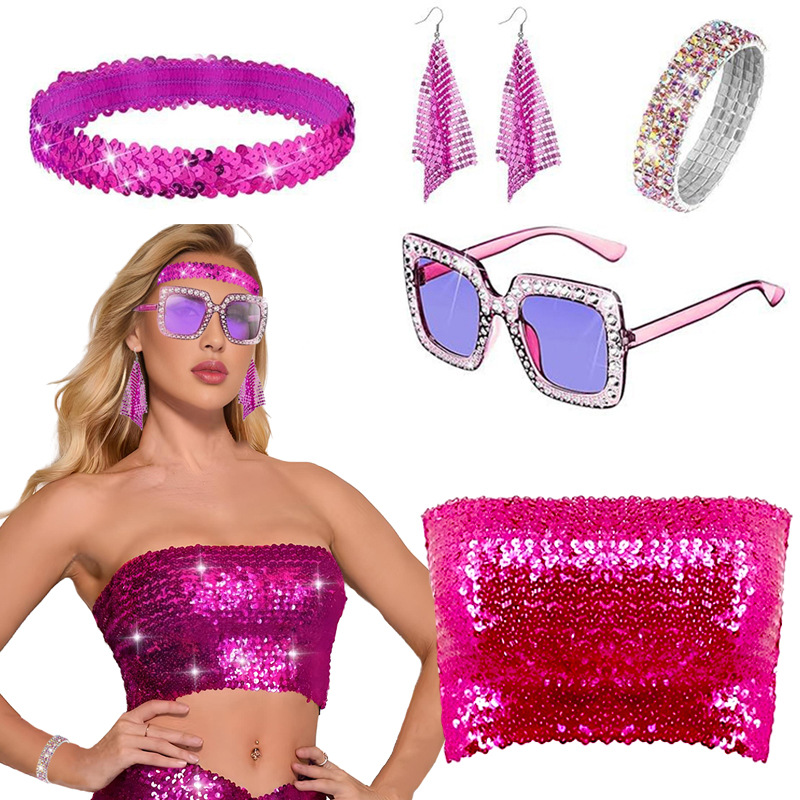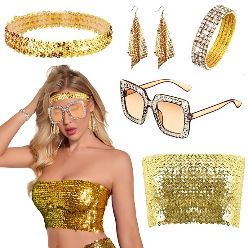 迪斯科女士服装套装 70 年代亮片抹胸和配饰首饰,适合生日舞会派对装扮