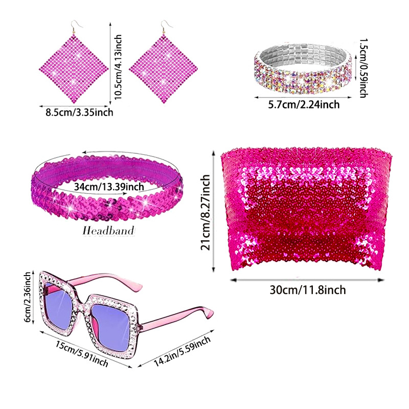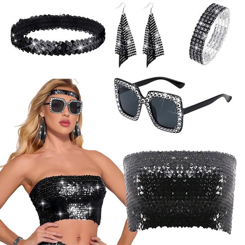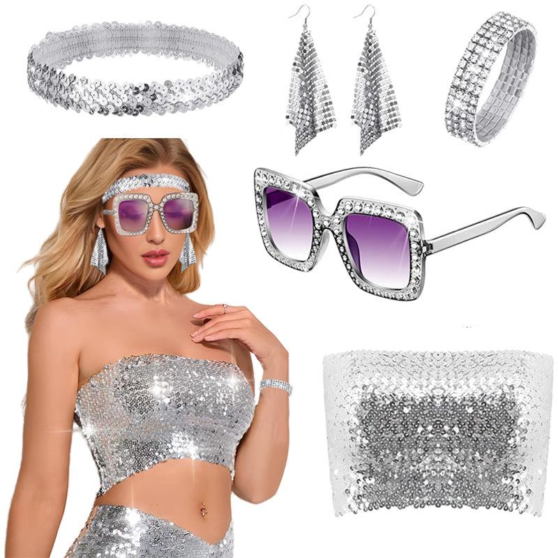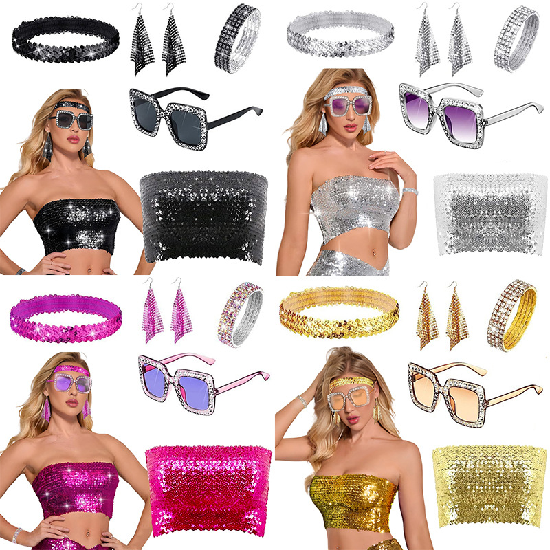 70年代ディスコアクセサリーレディース服スパンコールイヤリングブラジャーサングラスダイヤモンドブレスレットヘッドバンドセット