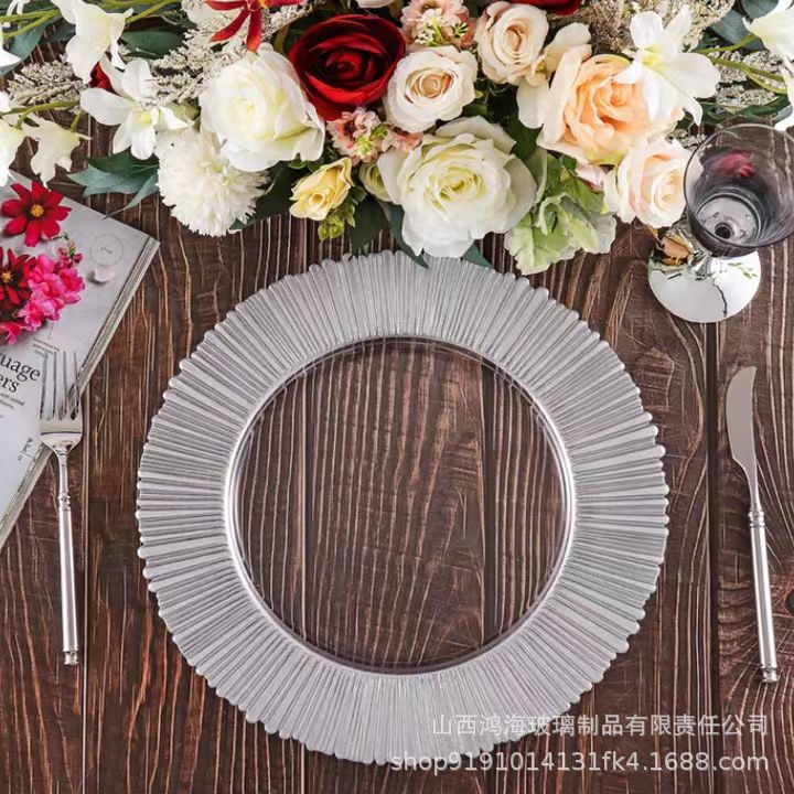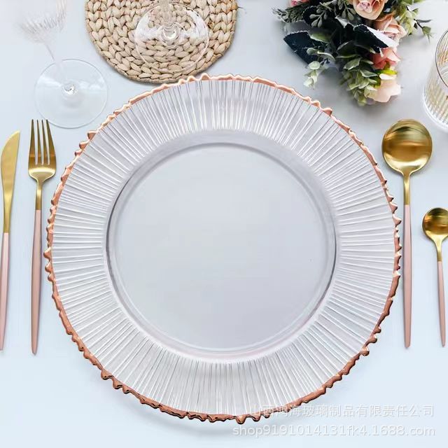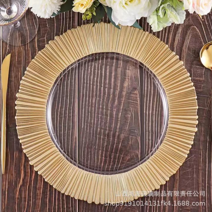 卸売半線電気メッキゴールドエッジステーキプレートフルーツサラダプレート結婚式特別なガラスマットプレートプレート