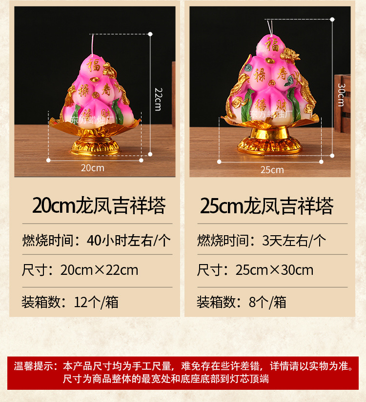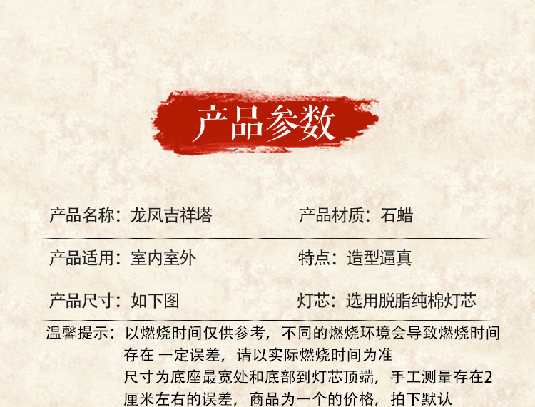 サイズ 小型竜鳳吉祥塔-1個,中号龍鳳吉祥塔-1個,大サイズ龍鳳吉祥塔-1個,トランペット龍鳳吉祥塔-1箱48個,中号龍鳳吉祥塔-1箱12個,大サイズ龍鳳吉祥塔-1箱8個