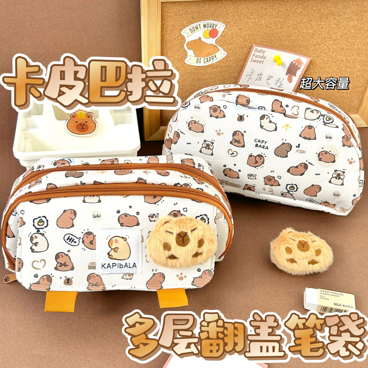 カピバラ柄フリップペンケース、多層大容量文房具ボックス、学生用鉛筆収納バッグ、卸売、携帯用
