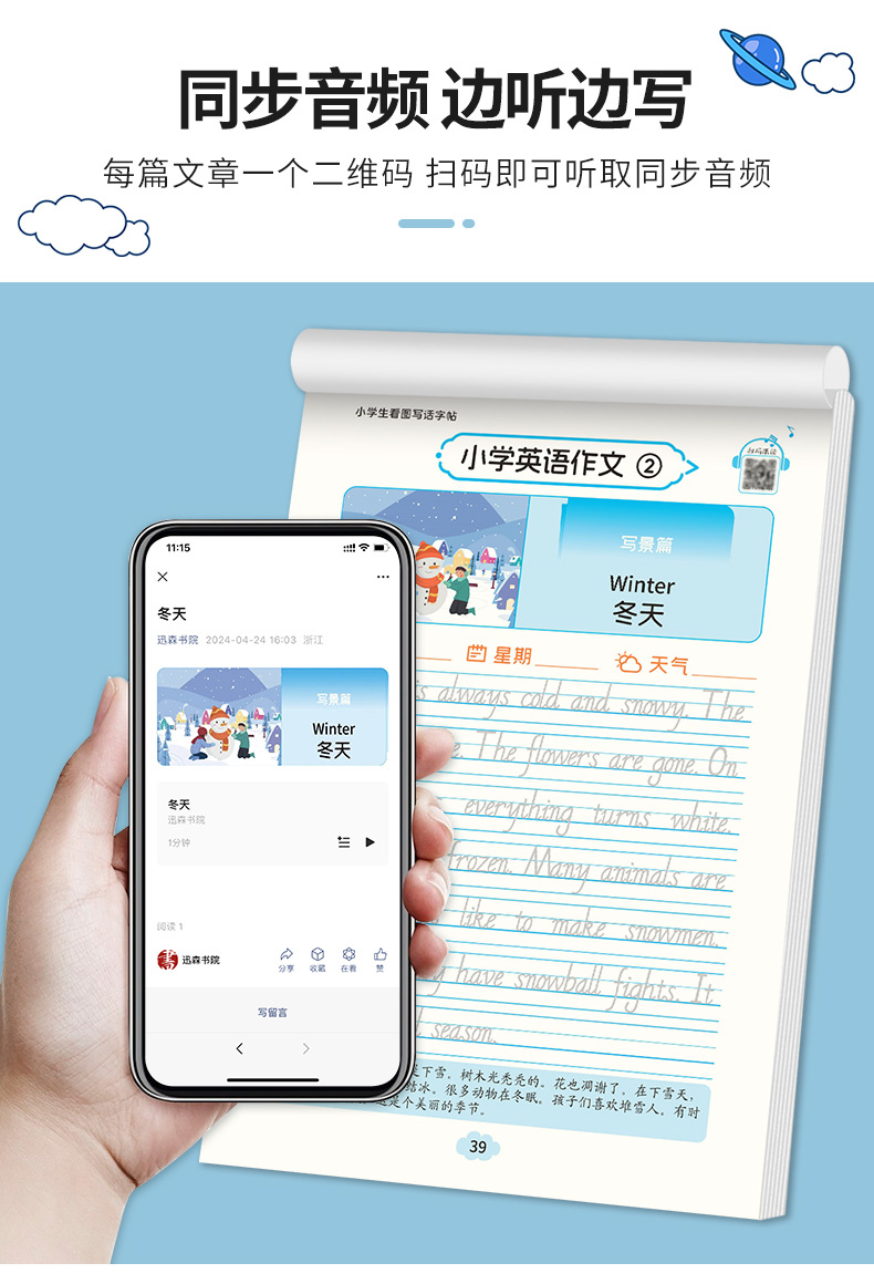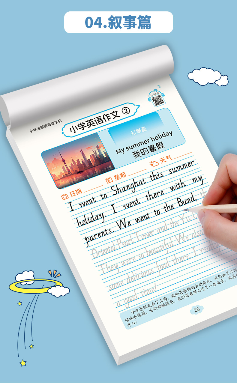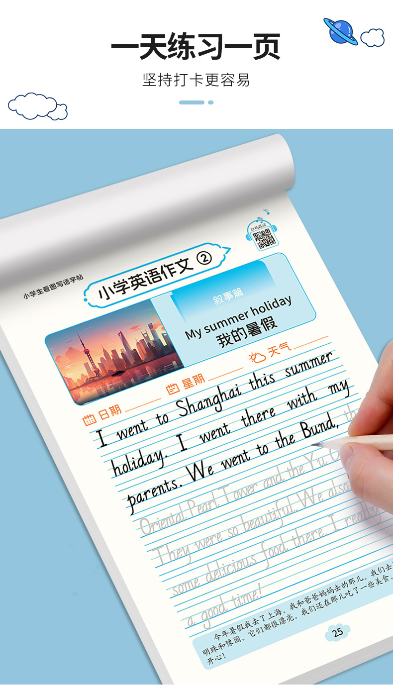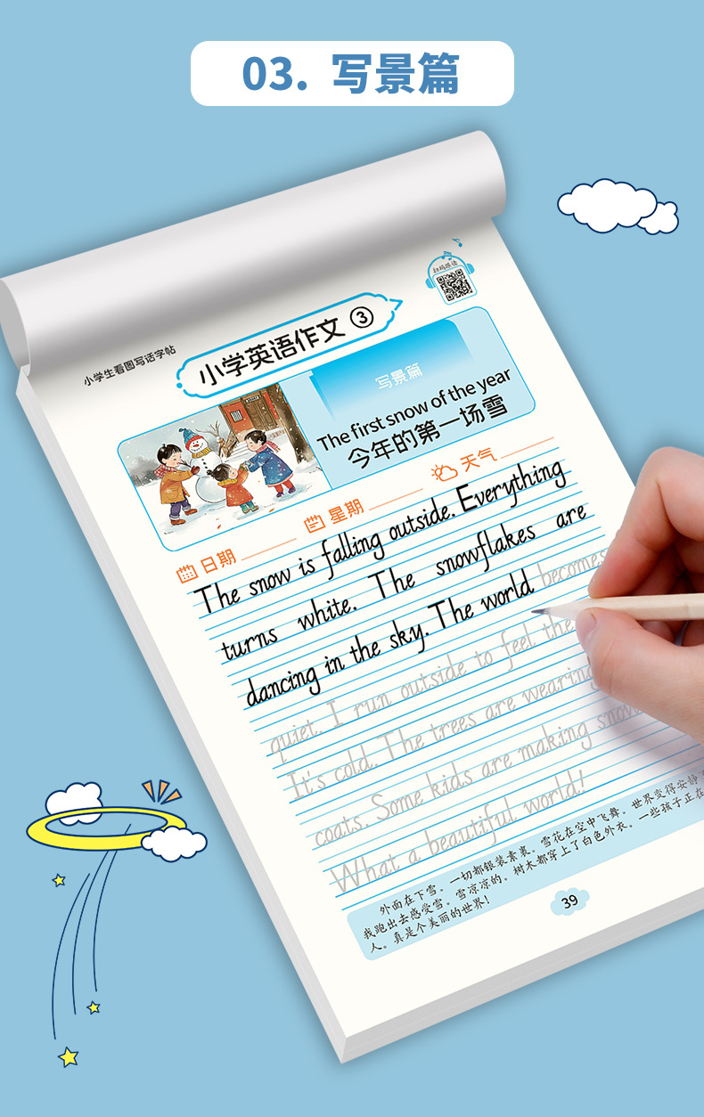 小学生は図を見て話を書きます。英語の作文は啓蒙します。