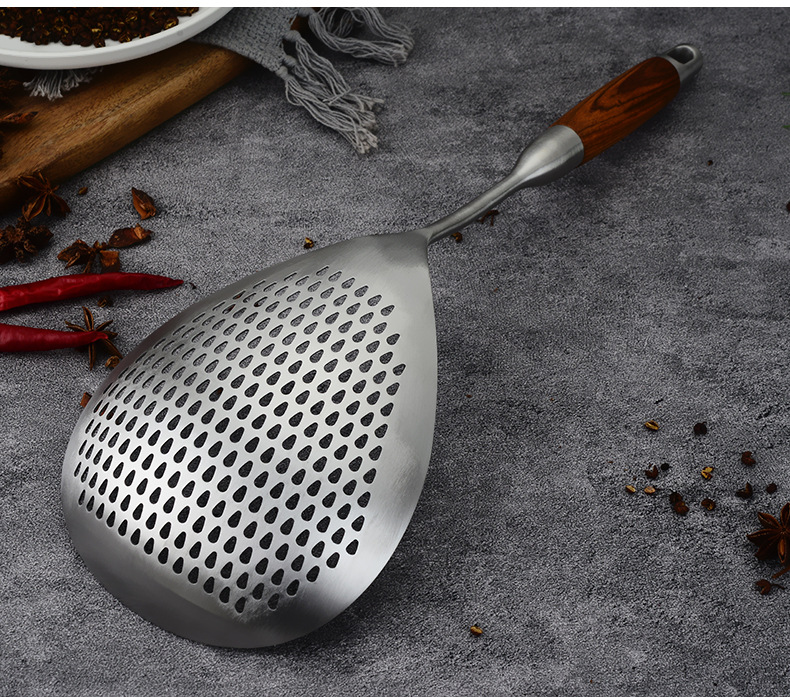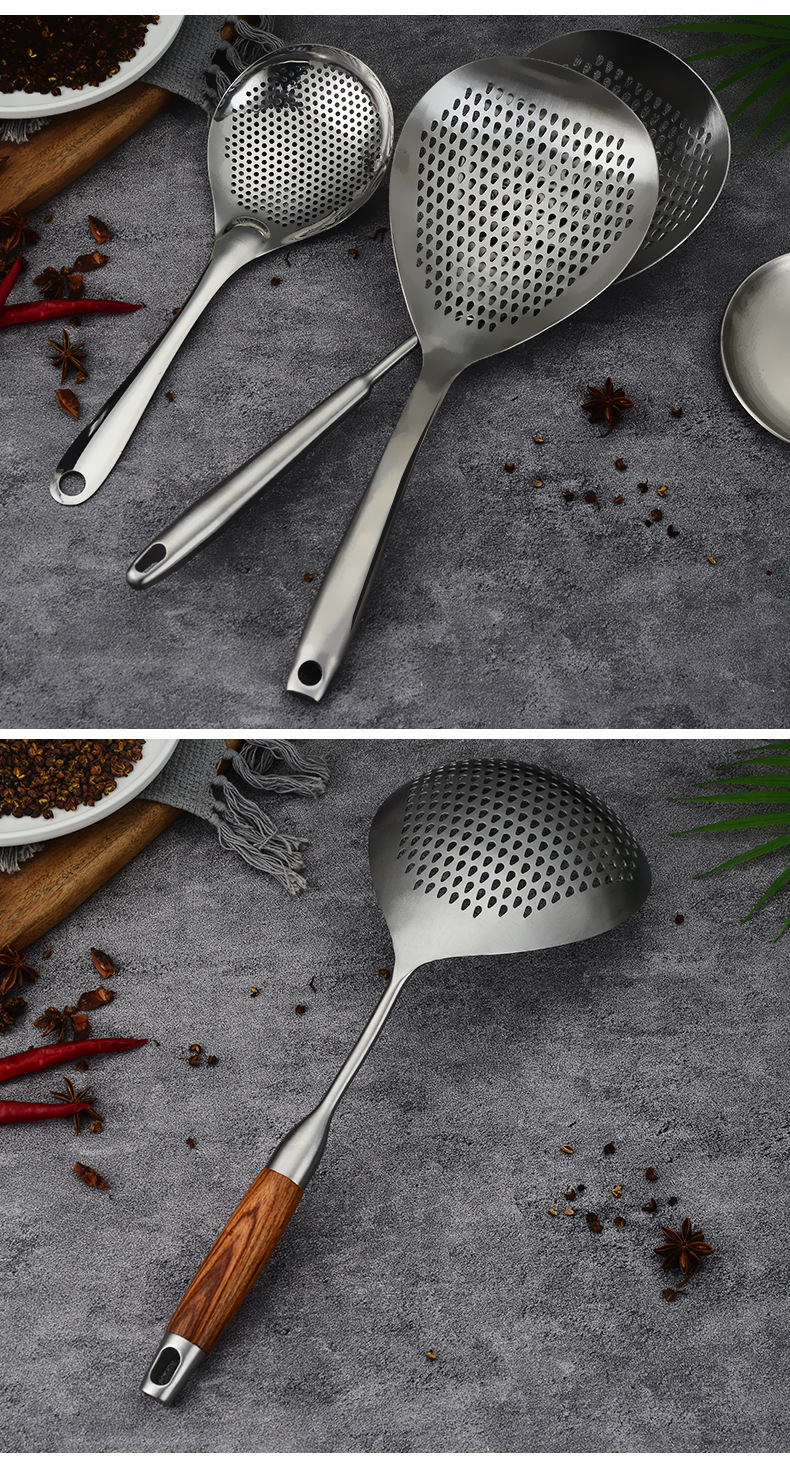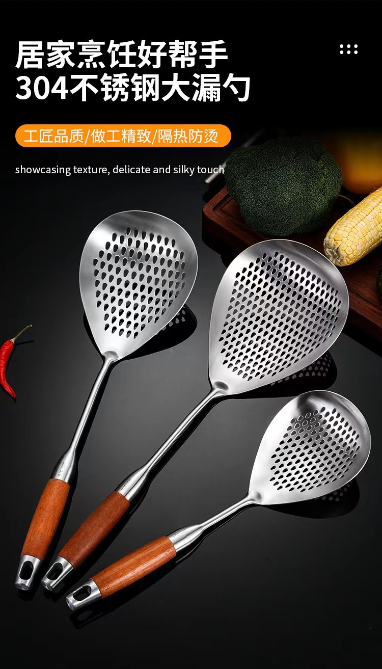 304ステンレス製の木柄付き大スプーン、麺用スプーン、揚げ物用フィルター、水切り多機能スプーン、厚みがあり耐久性があります。